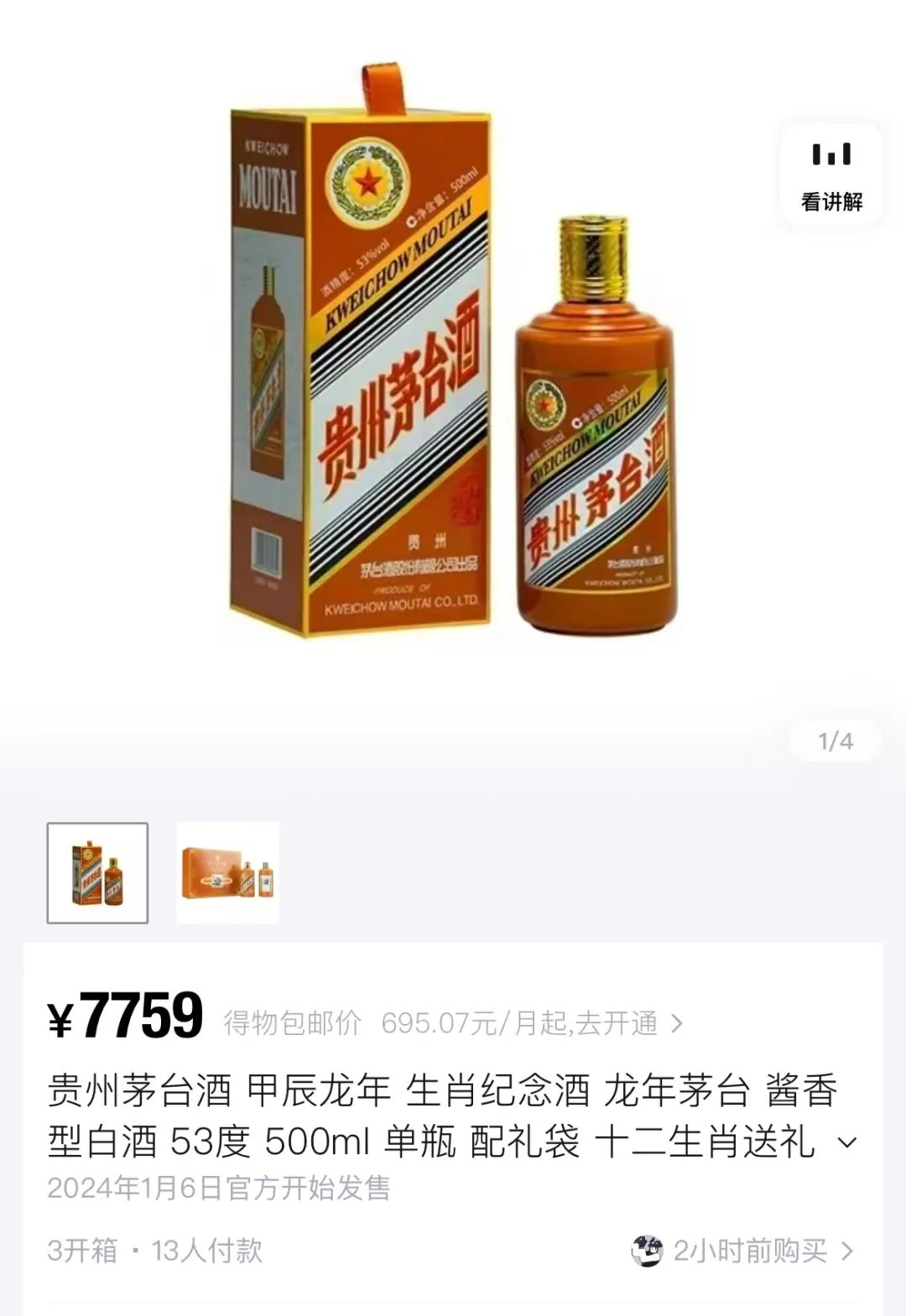证券时报记者此前查阅某第三方平台,显示龙年茅台报价为7759元/瓶,截至当时有13人付款。这一价格较市场指导价加价超5000元。