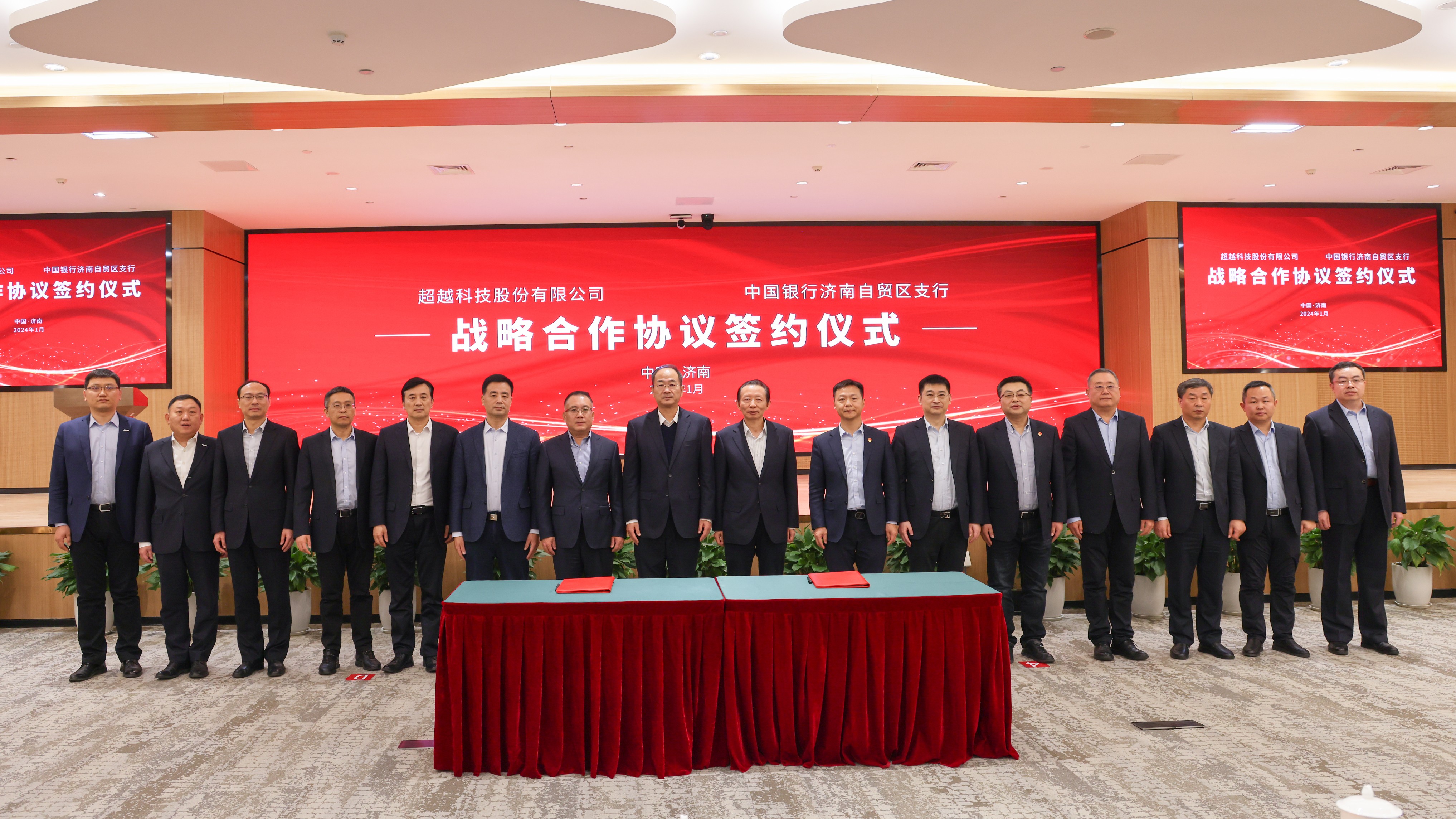 山东中行胡冲副行长、山东国投公司刘廷伟副总经理代表双方签署战略合作协议;中国银行济南自贸区支行李磊行长、山东国投公司子公司超越科技股份有限公司徐竹冰财务总监代表双方签订合作意向书。