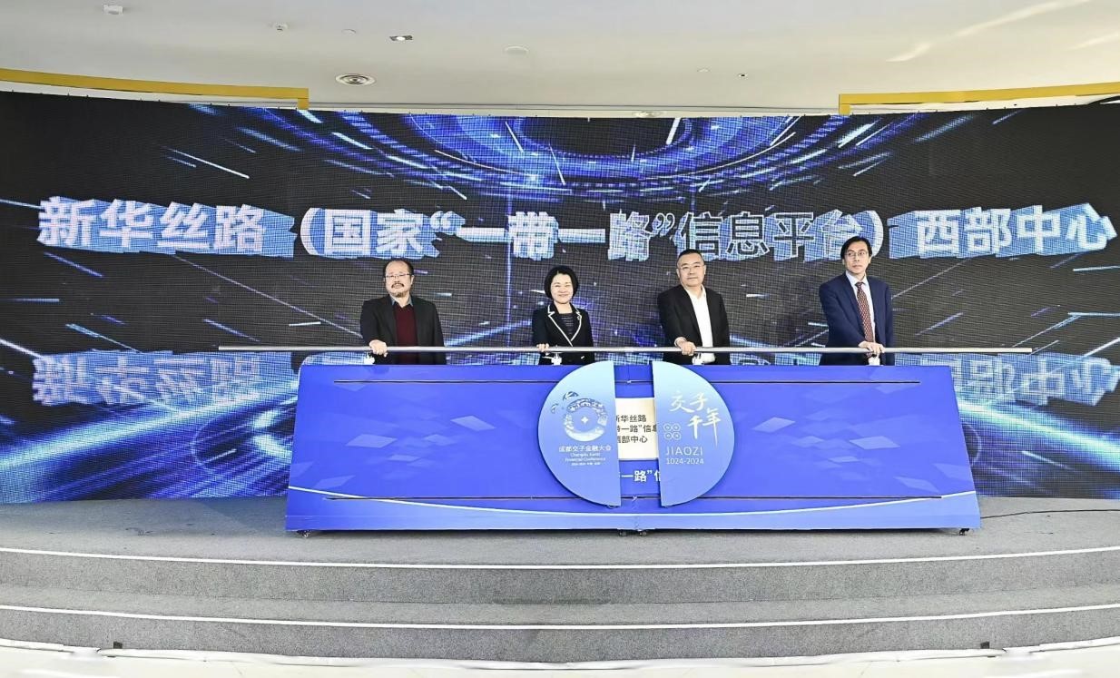 在此次成都交子金融大会上,新华社副秘书长徐姗娜、成都市地方金融监督管理局局长梁其洲、新华社四川分社社长王丁、新华社中国经济信息社总裁曹文忠共同为“新华丝路西部中心”揭牌。