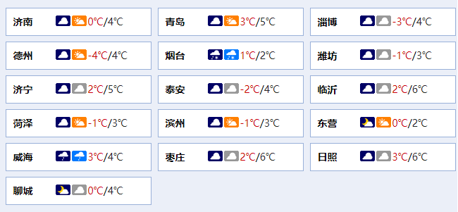 最高气温:青岛和鲁南地区5℃左右,鲁中山区0℃左右,其他地区3℃左右。