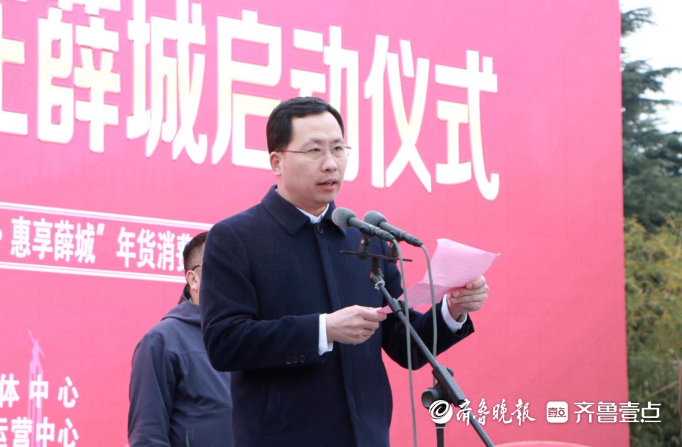 薛城区委常委、宣传部部长翁增光为活动致辞。翁增光介绍薛城文化底蕴深厚,旅游资源丰富。夏朝车正奚仲在这里发明了第一辆马车;商汤左相仲虺在这里发布第一份建国纲领;战国孟尝君在这里留下“食客三千”的佳话;近代又诞生了闻名中外的铁道游击队、运河支队,是一座历史厚重的人文之城。本次活动将紧紧围绕“家家挂红灯、户户贴春联、村村有好戏——回村过大年”的主题,组织策划国潮民俗庙会、民间游艺展演、非遗手造体验等一系列“贴近实际、贴近生活、贴近群众”的活动,引导城市居民到乡村“寻年味、赏民俗、过大年”,在双向交流中实现城乡互促共进。要突出融合创新,着力打造“文化大集”“年货大集”“手造大集”“惠民大集”,推动城乡文旅市场蓬勃发展,多措并举挖掘市场潜能、释放消费潜力。