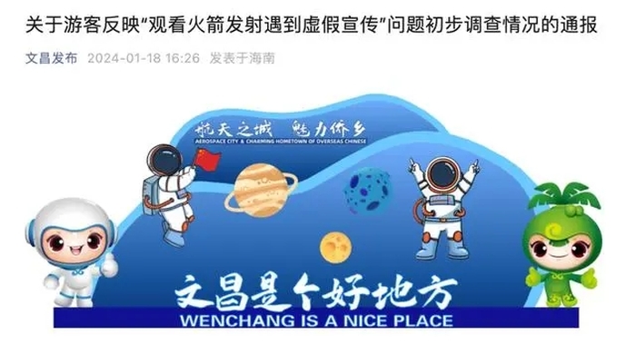 《通报》称,1月17日晚,文昌市旅游和文化广电体育局接到游客投诉,称“花费2888元购买观看火箭发射内场票,实则被带到周边房顶,购买旅游产品和实际情况严重不符”。对此,该局高度重视,立即联合文昌市市场监督管理局、市综合行政执法局等部门到现场调查处置。1月18日上午,文昌市市场监督管理局已对涉案企业神州航天科普教育基地(海南文昌)有限公司涉嫌虚假宣传情况予以立案,市综合行政执法局已对涉案企业无证经营旅行社业务和接团领队人员无证进行导游活动的违法行为予以立案,案件正在进一步调查取证中。