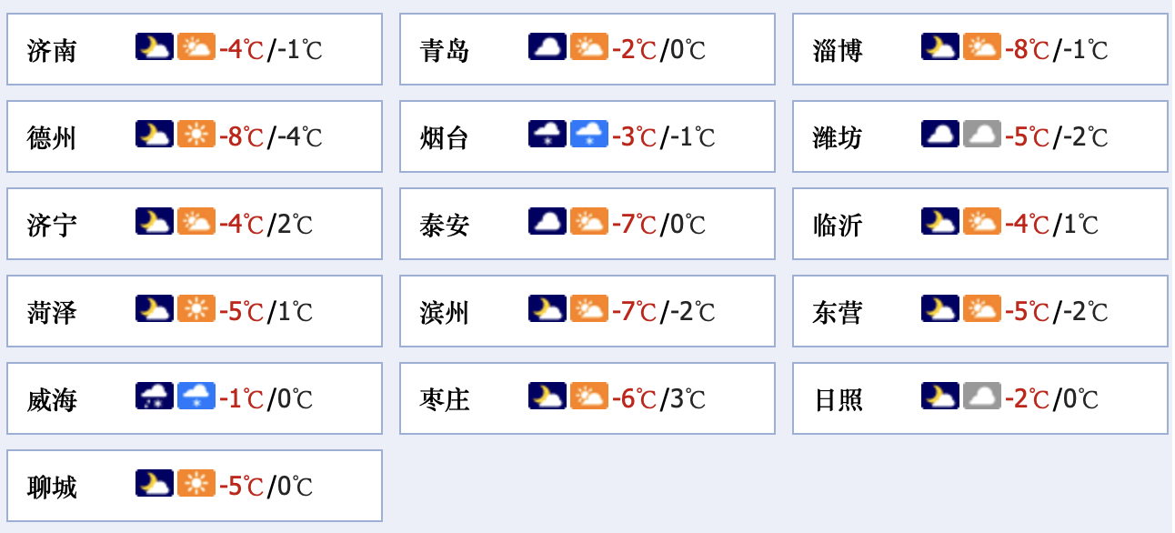 最高气温:鲁南地区2℃左右,鲁中山区和北部沿海地区-3℃左右,其他地区-1℃左右。