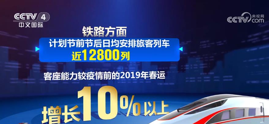 铁路方面,计划节前节后日均安排旅客列车近12800列,客座能力较疫情前的2019年春运增长10%以上。民航方面,预计日均保障航班1.65万班,同比增长24%。今年春运期间全国铁路预计发送旅客4.8亿人次,同比增长37.9%;民航旅客运输量预计突破8000万人次,同比增长44.9%。