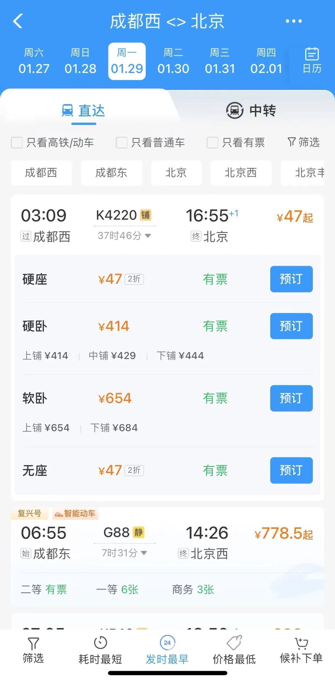据央视新闻报道,春运火车票加大优惠力度,普速列车票价最低两折、动车组票价最低三折。近日记者从12306平台查询发现,成都至北京的K4220次列车,春运期间硬座票价执行全价的2折,乘客支付47元就可以从成都西站坐到北京站。