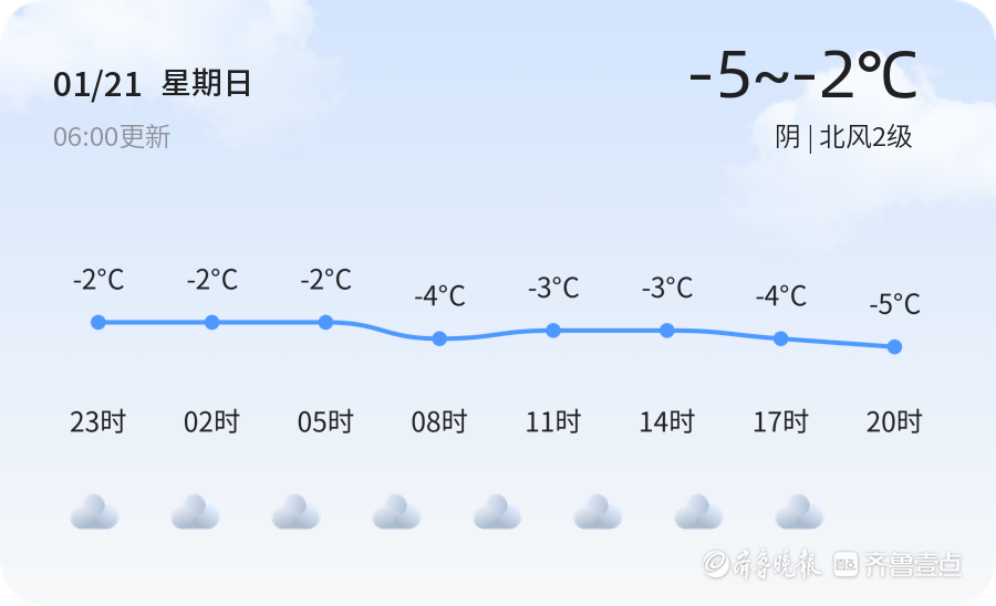 阴,温度 -5~-2℃,北风2级。未来三天最高温度-2℃,最低温度-8℃。主要以晴天为主,可能阴天,请密切关注天气情况。