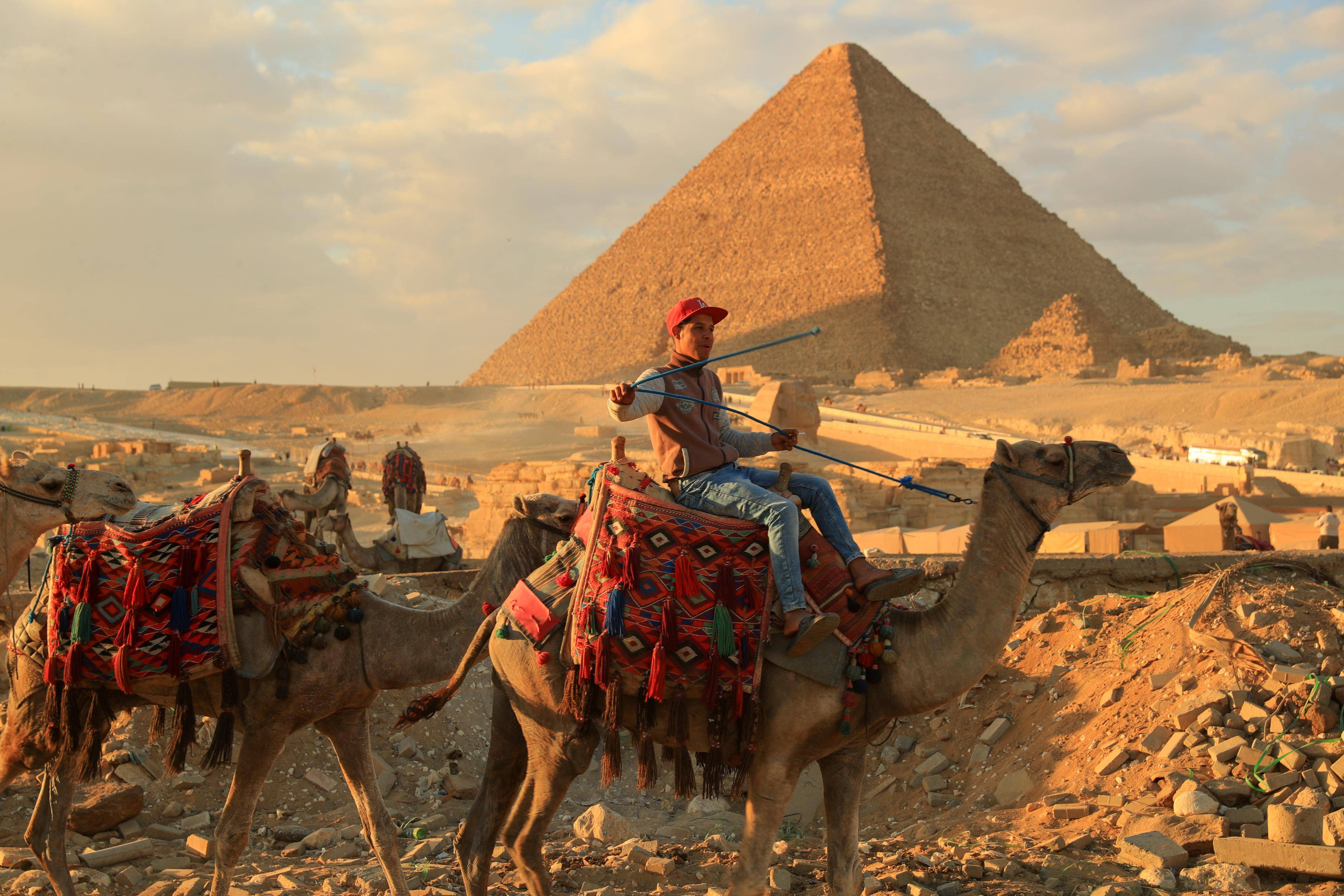 1月24日,游客骑骆驼游览埃及吉萨金字塔景区。 新华社记者 隋先凯 摄
