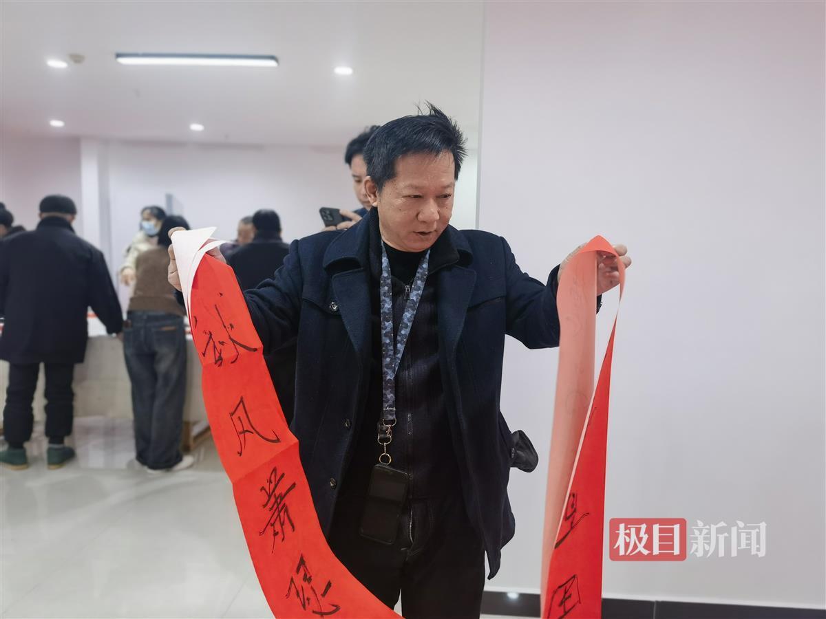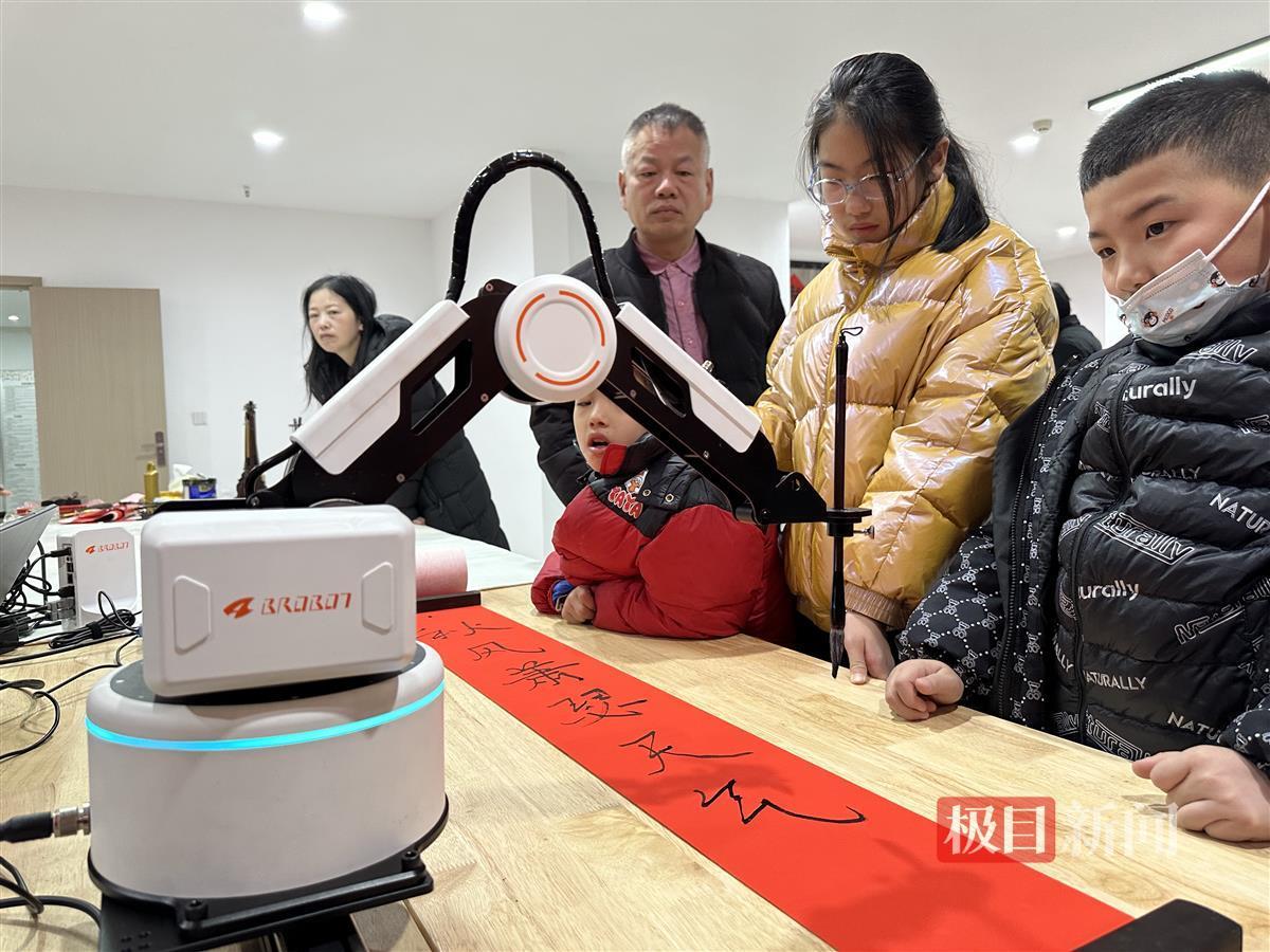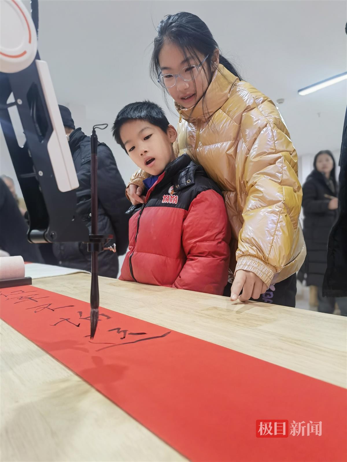 小朋友见此表演,也是感觉新鲜。“它写得有点像瘦金体。”家住祥龙社区的小学五年级学生邹欣怡,学了几年的书法,现场写了一副春联,上面写着“门迎百福福星照,户纳千祥云腾”。当她首次看到机器人写毛笔字后,告诉极目新闻记者说自己“被科技感震撼了”。