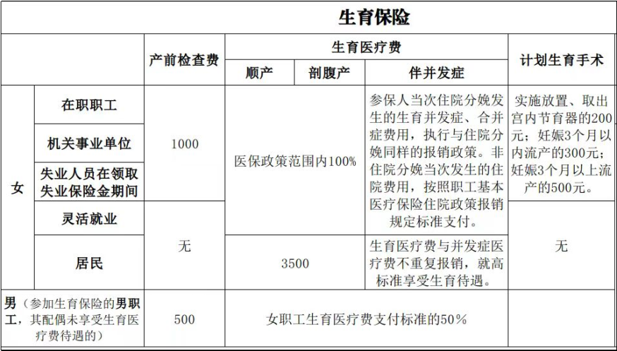 参保女职工住院分娩不设起付线,医保政策内费用100%报销;定额享受1000元产前检查费;参保居民定额报销3500元。