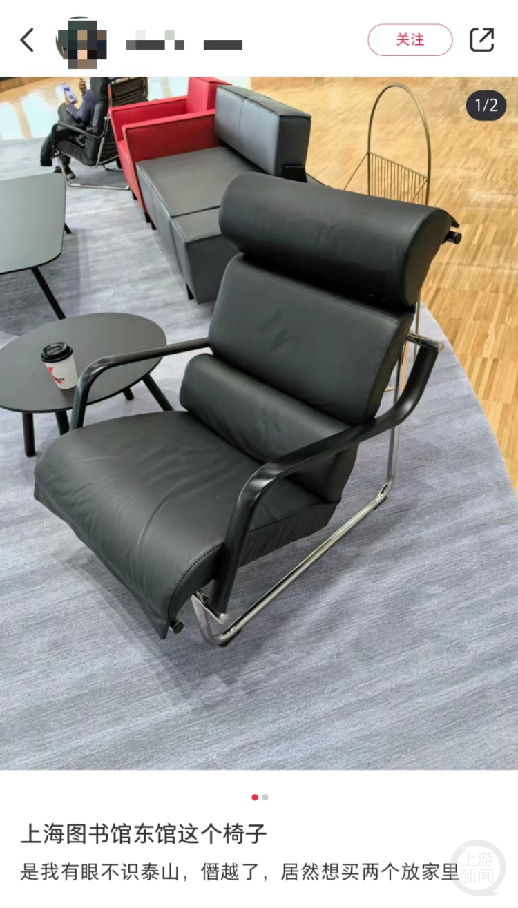 记者搜索上海图书馆官方微信公众号发现,今年1月12日,该公众号曾发表了一篇名为《东馆7F城市客厅 | 最舒适的座椅,以书为伴,“书香客厅”带来全新阅读体验》的文章,介绍了上图东馆内提供的各种座椅。其中,最受欢迎的就是七楼那些Karuselli躺椅。另外,经典的Ateljee沙发、Remmi座椅、CNC沙发等,均有展示。