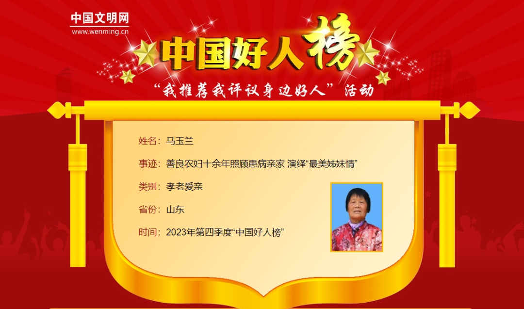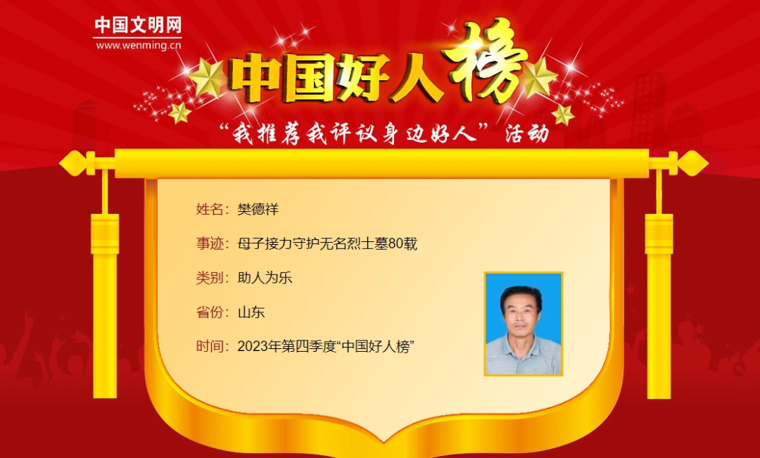 1月31日,2023年第四季度“中国好人榜”发布仪式暨全国道德模范与身边好人现场交流活动在重庆市大足区举办。经各地推荐、网友点赞评议和专家评审等环节,全国共有152人(组)助人为乐、见义勇为、诚实守信、敬业奉献、孝老爱亲身边好人光荣上榜。其中,禹城市莒镇小樊村村民樊德祥获评助人为乐类“中国好人”、齐河县焦庙镇周庄村村民马玉兰获评孝老爱亲类“中国好人”。截至目前,德州已有35人入选“中国好人榜”。