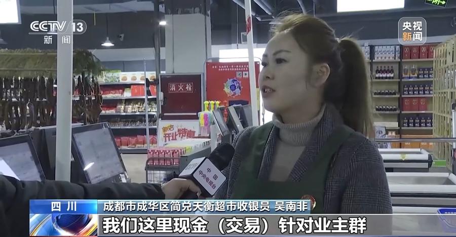 成都市成华区简兑天衡超市收银员 吴南非:我们这里现金交易的话是针对的是业主群,老年人居多,收的现金和线上支付的都差不多,就是对半。