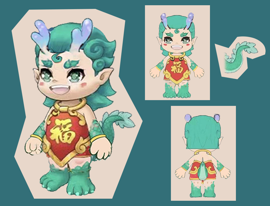 “小瑞龙”的形象设计灵感,来源自红山文化出土被称为中华第一玉雕龙的C形玉龙。红山文化距今约有 5500 年历史,出土的这件“C”字形玉龙,带有浓重的幻想色彩,代表了早期中国龙的形象。设计团队概括出C形玉龙的形、意、色、质四个参考点,以此为标准设计“小瑞龙”的造型、配色、质感以及角色寓意,并进行卡通拟人化创作。为了突出“小瑞龙”可爱的形象,将其设定三头身比例,采用祥云发髻、传统布兜服饰突出中国传统。