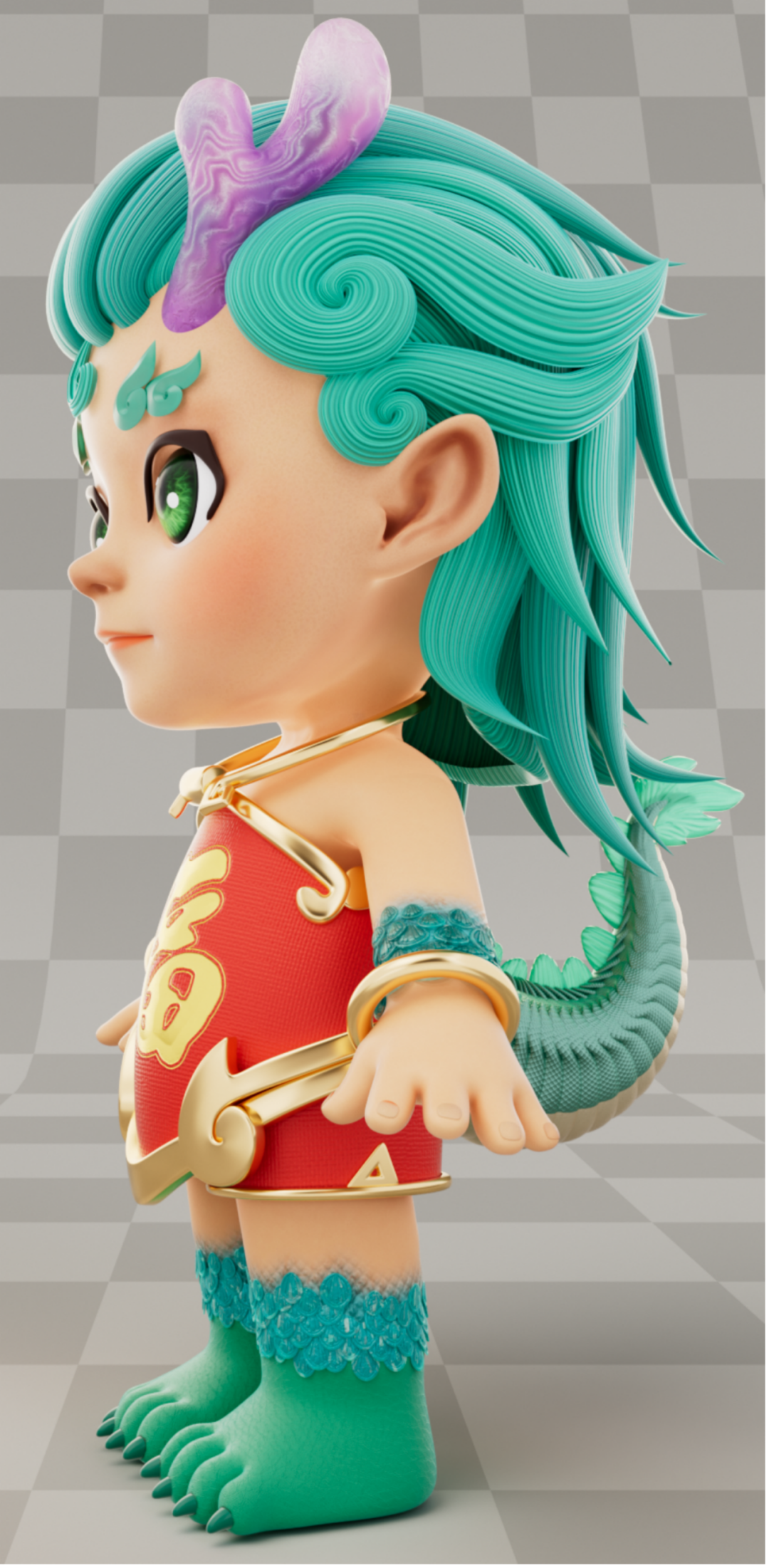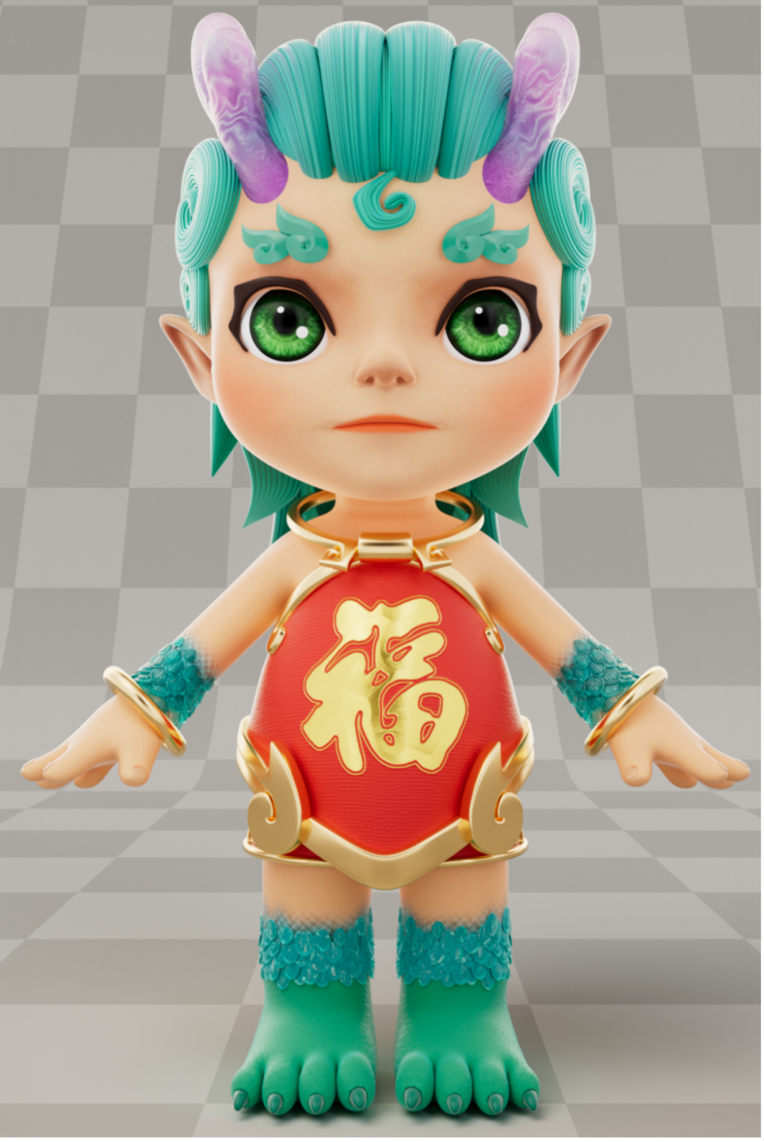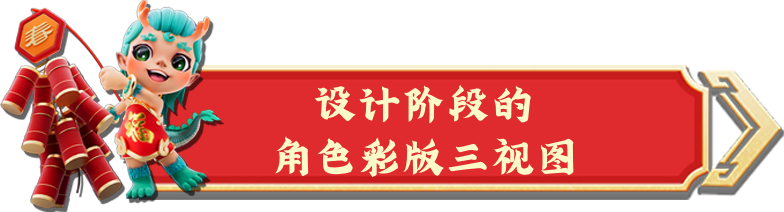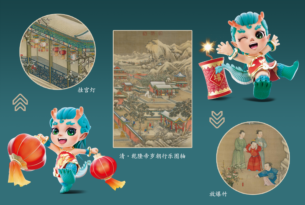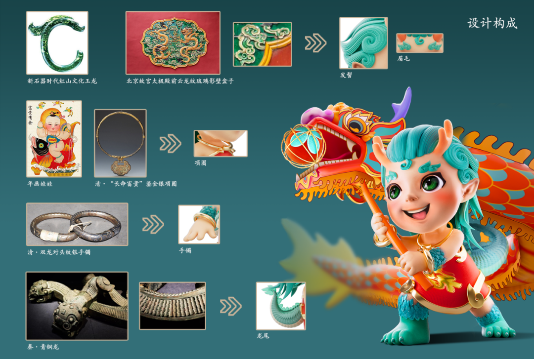 “小瑞龙”身上的配饰源自大家熟知的年画娃娃,在中国传统文化中,佩戴长命锁、长寿镯寓意健康长寿、吉祥如意。以清代“长命富贵”鎏金银项圈和双龙对头纹银手镯为设计灵感,将文物进行二次创作,打造出更符合“小瑞龙”形象的金色项圈和手镯。小瑞龙身上的龙鳞则以秦朝青铜龙为参考,栩栩如生、生动灵巧。