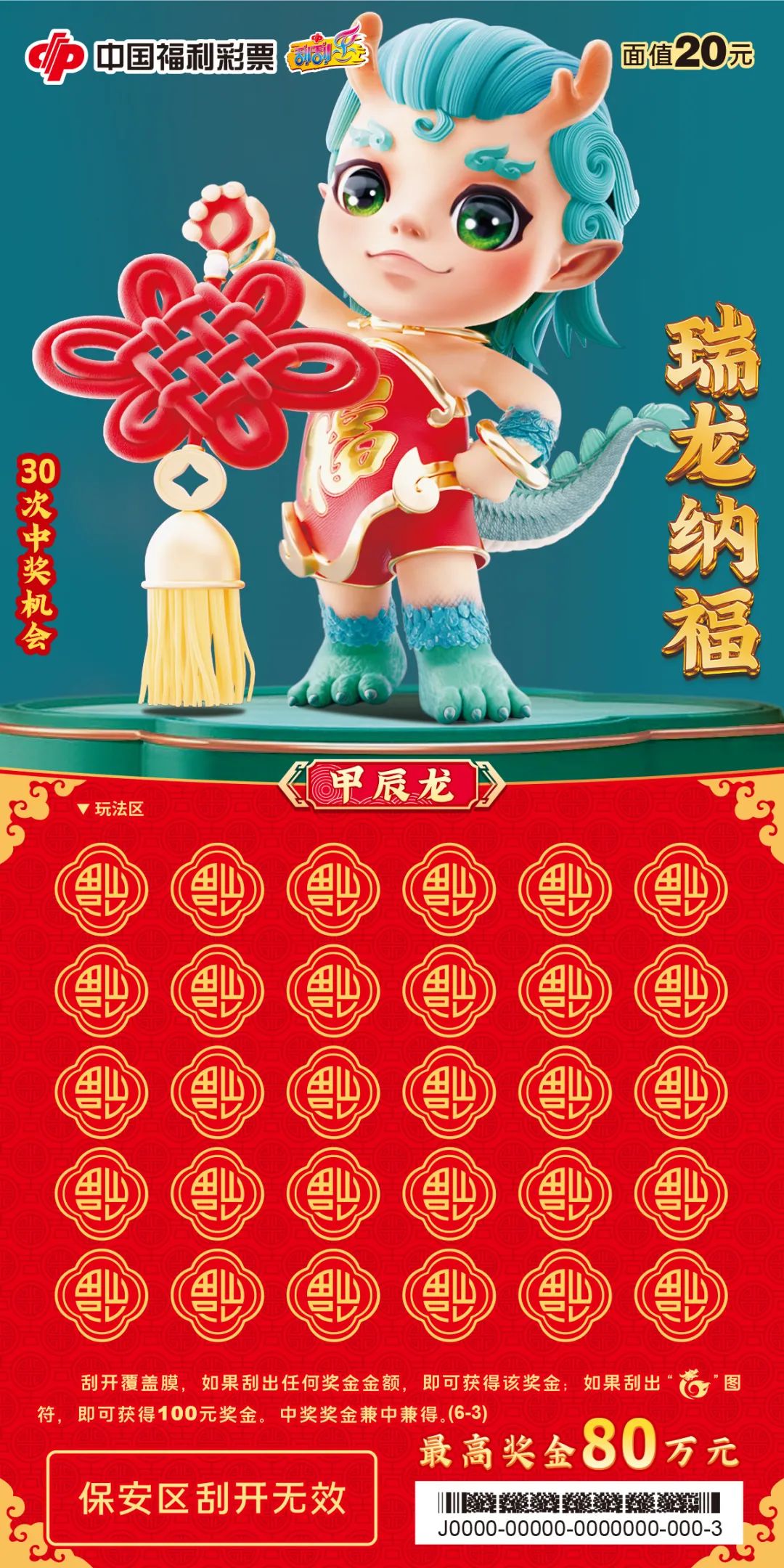 一张张画面精美、玩法有趣的即开票备受购彩者喜爱 。大家纷纷表示,“甲辰龙20元-瑞龙纳福”游戏让人眼前一亮!与以往的卡通画面不同,一只只活灵活现的立体“小瑞龙”是福彩刮刮乐首次运用3D技术,根据中国传统青龙形象特征,进行卡通拟人化创作而设计出的“小瑞龙”形象。进而结合中国传统民俗,衍生出6个不同的画面,展现出了春节喜庆祥和的氛围。