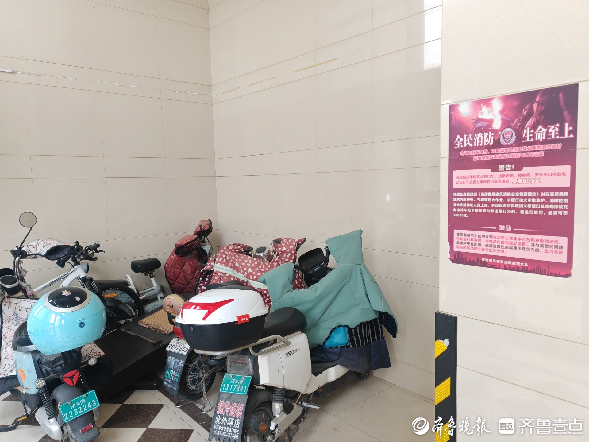 “禁止电动车进入电梯”“电动车上楼充电害人害己”“电动车容易引起火灾”……在记者走访的天桥区滨河国际城、市中区银丰花园、高新区东城逸家、历城区华山安置二区义华居等小区内,小区宣传栏、安全通道、单元门上、电梯内等醒目位置上均张贴有关于电动车入楼隐患的标语,部分小区单元楼及电梯内的屏幕还会播放相关警示广告。但显然此类警示并没有“挡住”电动车的路,甚至不少电动车就停在警示标语的正下方。