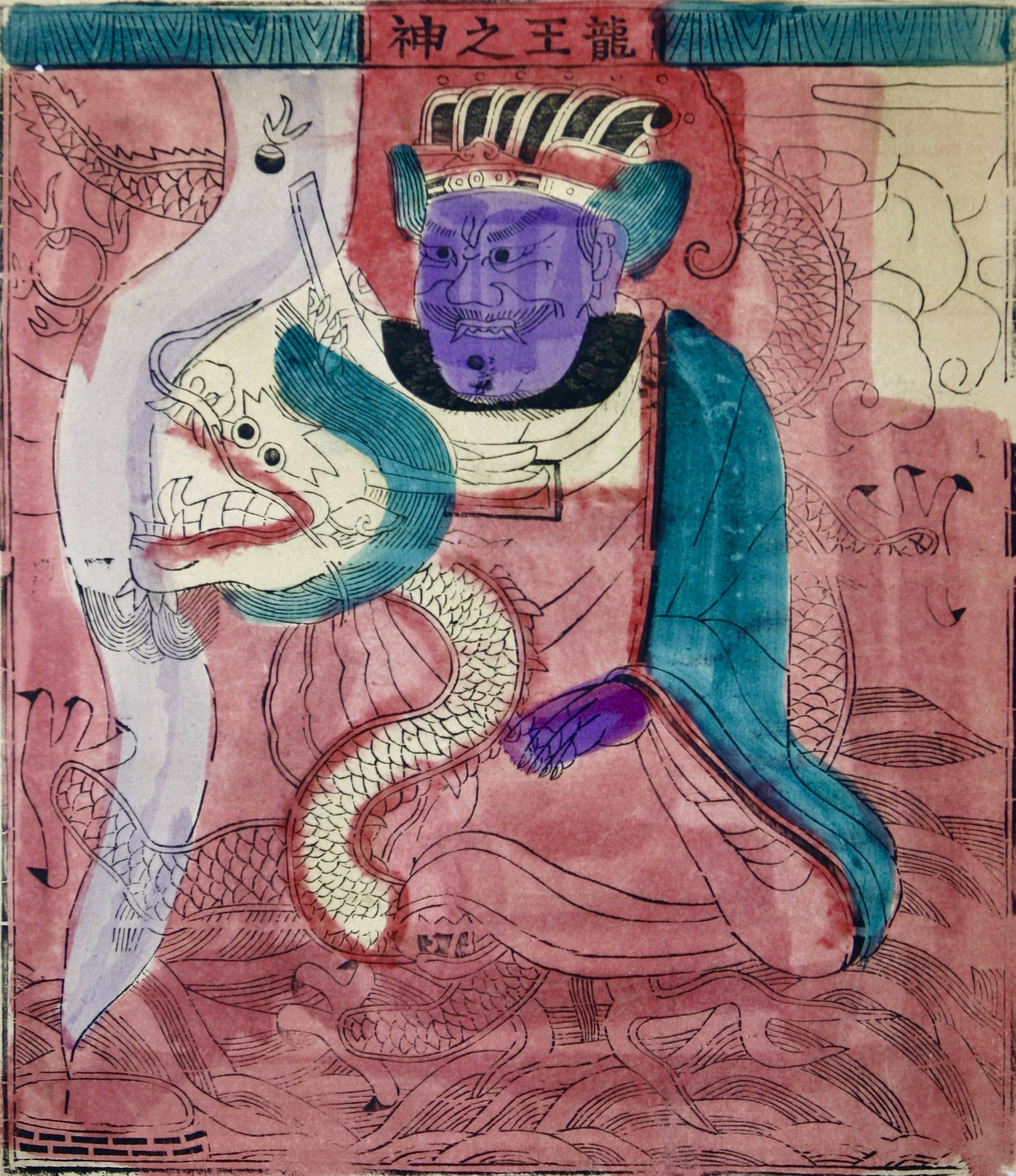 明代,以记述北京名胜、民情而见长的《帝京景物略》中记载,北京凡岁时不雨,各家各户便贴龙王纸马于门。流传至今的北京纸马中就有《龙王之神》一幅,图中的龙王头戴梁冠,面部和手部皆为青紫色,毫毛冲冠,鬓毛虬髯根根分明,身着绿色袍服,手举笏板,身骑一四爪之龙行于水中。该纸马为北京特有的“百份”形式,在制作时仅印出墨线,以彩笔涂抹上色,墨线之精细与涂色之写意风格对比鲜明。云南甲马中有不少龙神、龙王,当地人称“谢水纸”,每遇水患,人们便于河岸以甲马祀龙王,期盼风调雨顺。