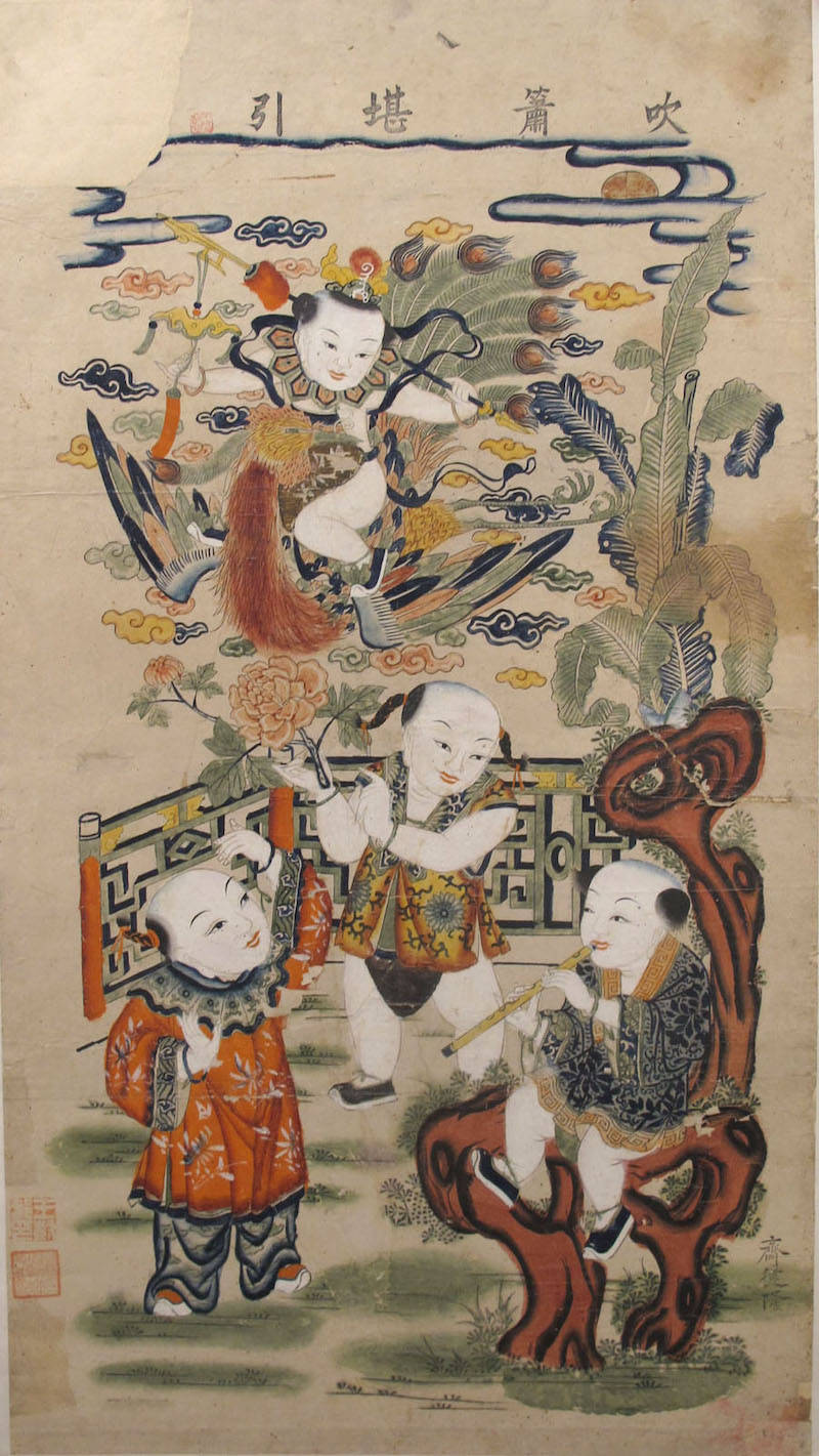 天津杨柳青年画中有较多“吹箫引凤、攀桂乘龙”主题的年画,多为三裁形式,其画面背景设置在云端,图中人物主要为一仙女和一头戴太子冠之少年。其中一幅中的仙女乘凤吹箫,少年手执芦笙,二人身后皆有手举仪仗的随侍。另一幅中只有少年和仙女二人,红衣少年为太子样,怀抱如意,乘于青龙之上,回首看向吹箫引凤之仙女。两幅作品均呈左右构图,首尾呼应,点明了“龙凤呈祥”的寓意。王树村先生捐赠给中国美术馆的一对名为《吹箫堪引凤、攀桂喜乘龙》的年画,两幅为对称构图,民间称此形式为对屏,又因其为结婚时使用,故也称喜屏。二画面上共绘八名身穿华服的童子,画面上方童子均头戴太子冠,分别骑凤乘龙,一人肩上扛戟挂磬,取“吉庆”之意,另一童子肩扛如意、双鱼等,寓“万年如意”。画面下方的童子或弄箫吹笙,或执桂花牡丹等吉祥花卉,表达了希冀富贵、求取功名、伉俪和美等心愿。此外,还有一幅署名《龙凤呈祥》的贡尖年画,也取材自“吹箫引凤”故事,画师将图像设置于富人家的庭院,石阶之上为吹箫之弄玉、萧史,院中有乘龙骑凤,手持寓意吉祥之物的几名儿童。画面上方写有:“飞龙大有,凤舞文明,九江八河,四海行。张牙舞爪,聚在云中,大能喷云吐雾,小能隐介藏形。看起来还是天子真龙,无宝不落,岐山凤鸣,五色霞光有威风,传国玺出在其中。无怪吹箫堪引凤,攀桂喜乘龙。将来可以坐正宫,龙凤呈祥,喜气盈门,亦算是乾坤造定。”以文字的形式再次注解了画面之寓意。
