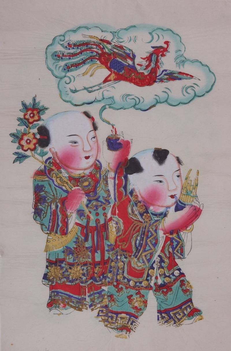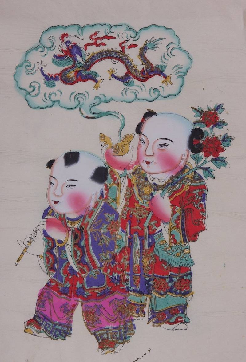“龙凤呈祥”一直是各民间美术品类热衷于描绘的题材,年画中的这一主题多与神话传说人物弄玉和萧史有关。相传春秋时秦穆公女儿弄玉,嫁与善吹箫的萧史为妻,后来二人乘龙跨凤而去。汉·刘向《列仙传•萧史》亦有类似记载,称“萧史者,秦穆公时人也,善吹箫,能致孔雀白鹤于庭。穆公有女字弄玉,好之,公遂以女妻焉,日教弄玉作凤鸣。居数年,吹似凤声,凤凰来止其屋。公为作凤台,夫妇止其上不下数年。一旦,皆随凤凰飞去。故秦人为作凤女祠于雍宫中,时有箫声而已。”民间对此传说有诸多描述,并演变出“乘龙快婿”的成语,并借此“龙凤呈祥”之意表达对美满婚姻的期盼,并祝颂人们百年好合,生子显贵。