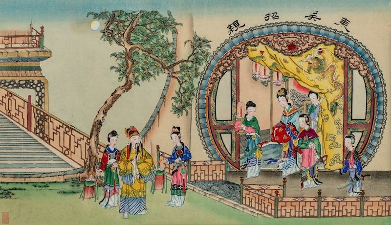 以龙凤为主题的年画中,取材自《三国演义》中刘备与孙尚香婚配的《龙凤配》也占比不少。《龙凤配》又称《东吴招亲》,是《三国演义》第五十四回故事,故事讲述孙权屡次向刘备索还荆州未得,乃用周瑜之计,假称以妹孙尚香许婚刘备,诓其过江,索还荆州。诸葛亮识破,将计就计,让赵云随备往,临行授以锦囊妙计,嘱其紧急时打开。刘备依锦囊拜会孙、周二人岳父乔玄,令其于吴国太处斡旋;吴约刘备至甘露寺相亲,弄假成真,刘备入赘东吴。天津杨柳青年画有《东吴招亲》一幅,图绘刘备与孙尚香成亲后,宫女提灯送刘备入洞房之情景,洞房帐幔之上,一条通体黄色的四爪龙描绘的栩栩如生。河北武强亦有多幅《龙凤配》年画,常搭配《回荆州》内容,以两个画面完整描绘刘备与孙尚香成亲以及赵云保驾回荆州的情节,画面对龙凤配新婚之喜悦、回荆州赵云之英武无畏,均描绘的相当突出。目前可见,在陕西、河北、天津、江苏、山东等地也都有《龙凤配》年画题材,形式不一。