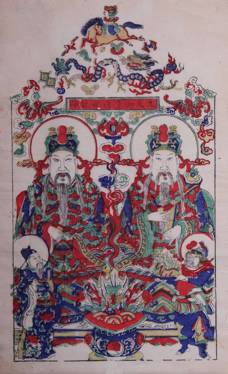 最后,年画中的龙远不止以上几种,其形式、状貌、纹样、功能之多,不胜枚举,此处只概略列举几处。以龙纹装饰为例,普遍流行于各地的纸马《天地全神》画面两侧边缘多竖立两桩盘龙旗杆,旗杆顶端也有龙头装饰,凸显出众神的磅礴气势,《灶王》纸马上也常用“双龙戏珠”图案作以装点。年画中还有用于祈雨的龙旗、神像帷帐上的龙、人物身着的龙袍等均有龙纹的出现,其形可分团龙、坐龙、行龙、云龙等。