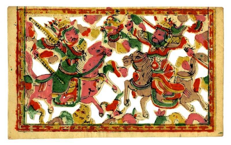 中国艺术研究院收藏的一幅天津杨柳青年画《泥马渡康王》,描绘了宋高宗赵构遭金兀术追击,及至江边,无有去路,危急之时得神人佑护,骑泥马渡江逃生,从而开创江南半壁江山的故事。图绘康王赵构骑马在江上奔驰,如履平地,前后有童子、侍卫护驾,康王头顶上方黑色云朵中幻化出腾龙一条,是对赵构未来天子身份的暗示。