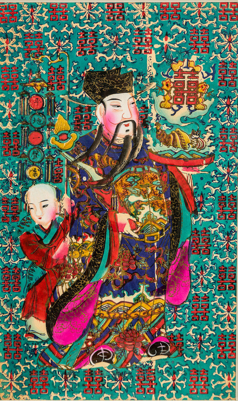 中国艺术研究院藏有一对天津杨柳青的文官门神年画,取名《鱼门三汲浪、平地一声雷》,典出北宋汪洙《神童诗》中的“禹门三级浪,平地一声雷”一句。“鱼门”即指“禹门”,也指“龙门”,《吕氏春秋》中记载为大禹治水时所凿。民间将科举考试中选称为“登龙门”。“三汲浪”指在乡试、会试、殿试三次科考中屡次中选。“平地一声雷”则颇有“十年寒窗无人问,一朝成名天下知”的意思。此对门神寓“及第登科”“飞黄腾达”之吉祥用意,在技艺手法上除六色套印外,加印金色,并饰绿地双喜字纹样,更显富贵华丽。