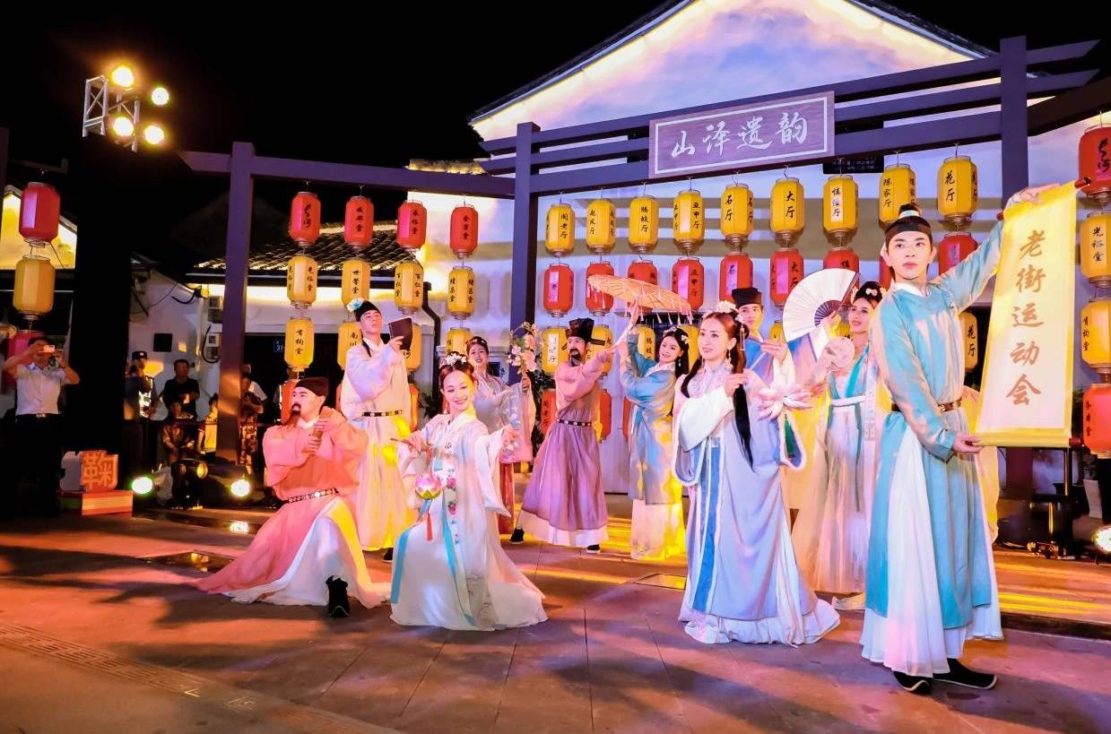 你可以在国潮年味市集采办山货特产,可以穿汉服巡游,沉浸式体验古风雅韵,可以欣赏、体验和了解非物质文化遗产细十番,还可以走进乡村影像馆(美创空间),感受似水“楼”年里的岁月悠长。