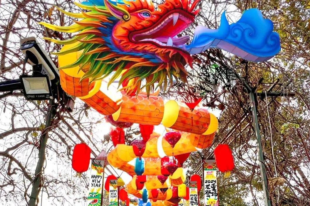 龙门古镇里的新年龙形装置已被点亮,昂首摆尾的龙形装置盘踞在上空,当夜幕来临,绚丽多彩、美轮美奂。