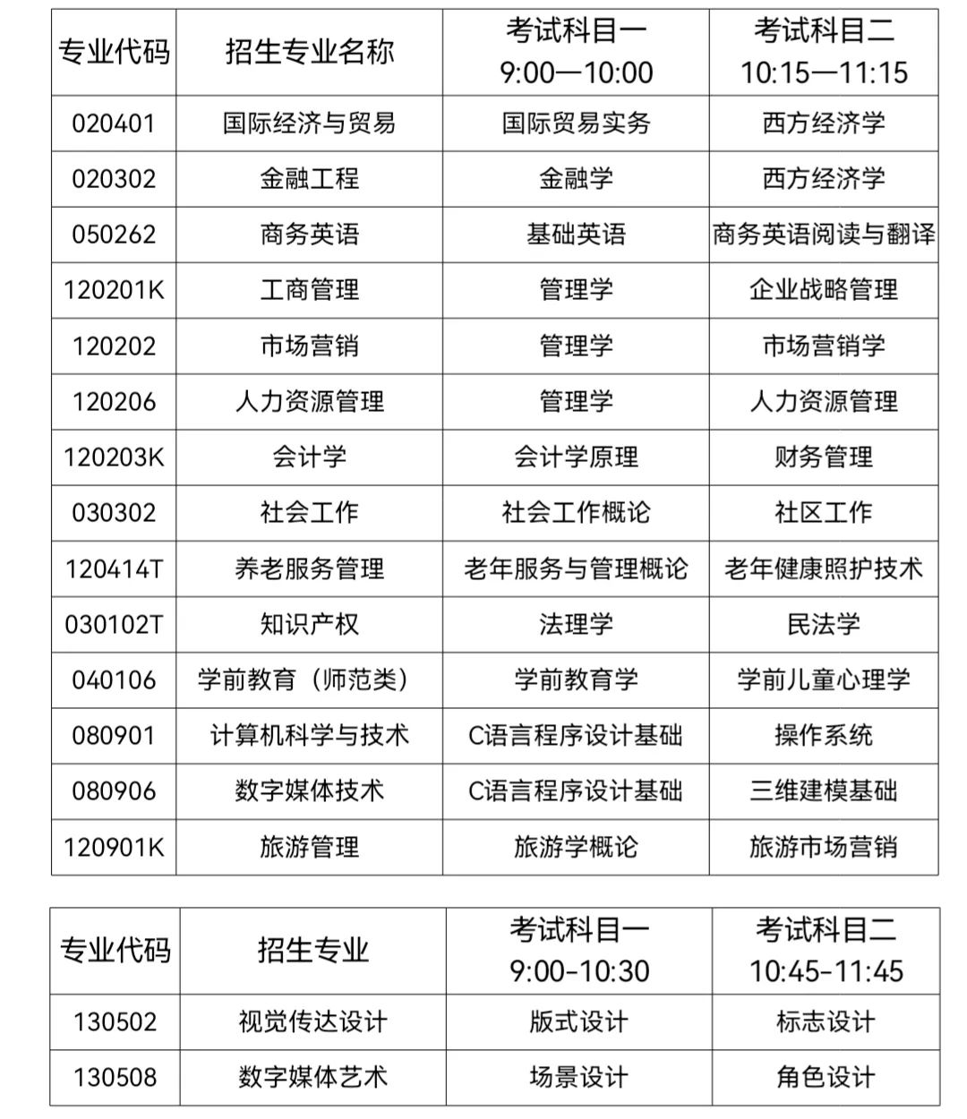 每专业考试科目包含两科,每科目满分100分,各专业考试科目及时间具体安排如下: