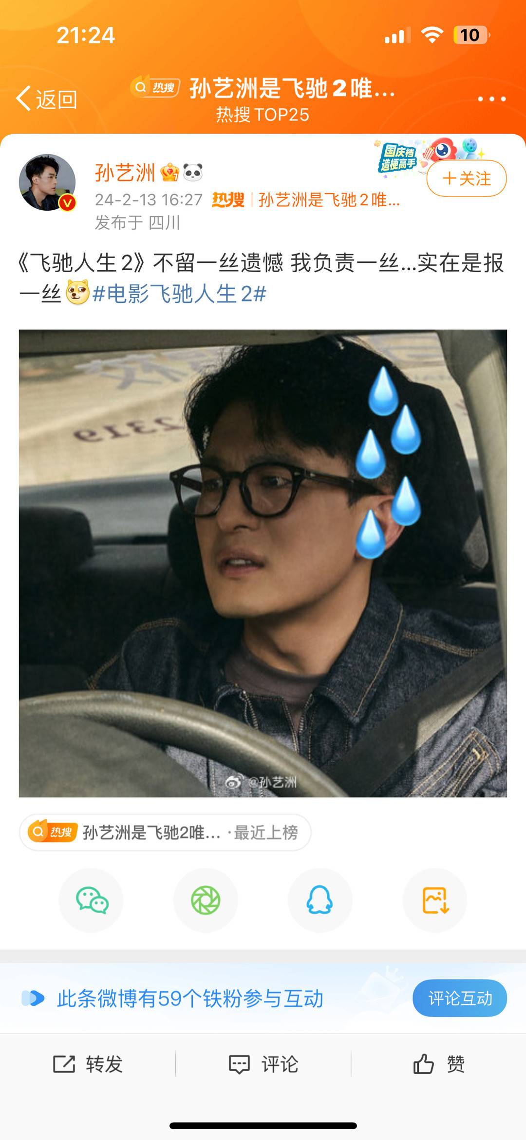有趣的是,孙艺洲的搞笑延续到了电影之外。路演结束后,#孙艺洲是飞驰2唯一的遗憾#火上热搜,他更新微博继续回应:“《飞驰人生2》不留一丝遗憾,我负责一丝……实在是报一丝。”