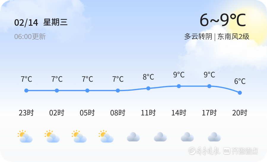 多云转阴,温度 6~9℃,东南风2级。未来三天最高温度10℃,最低温度-2℃。主要以晴天为主,可能伴有降雨天气,如有有外出的计划,请查询未来几天天气详情。