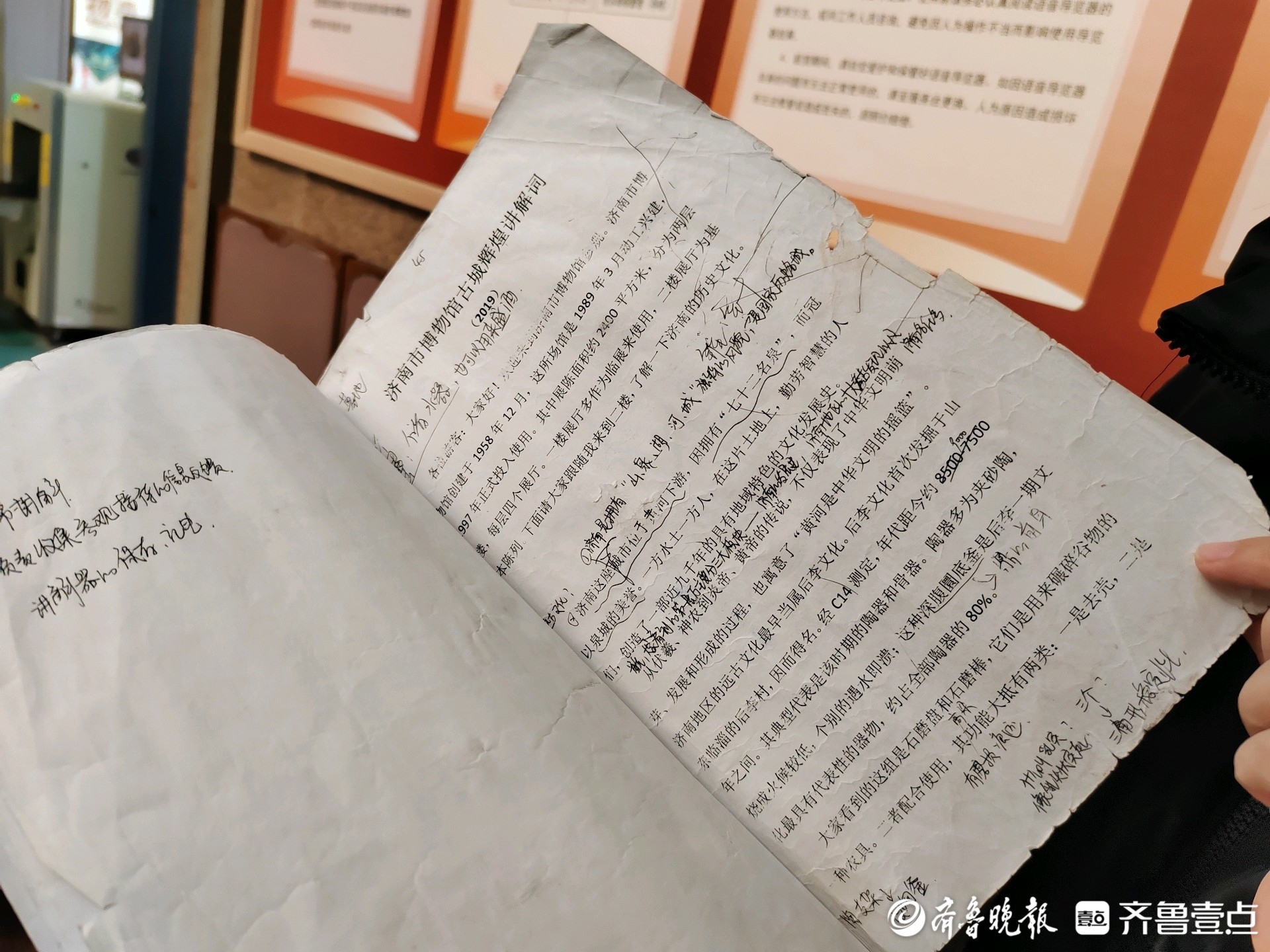 为了带给游客们更好的观展体验,尽管已经对每场展览的讲解词了如指掌,但每次开讲前,成诚都会再看一遍讲解词,不断深入了解。从第一本讲解词开始,成诚都会在原有解说词的基础上不断补充新内容。一本本讲解词因为经常被翻看,书角已经起毛打卷。它们记录下了成诚认真工作的身影,也记录下了馆里展览的变迁。