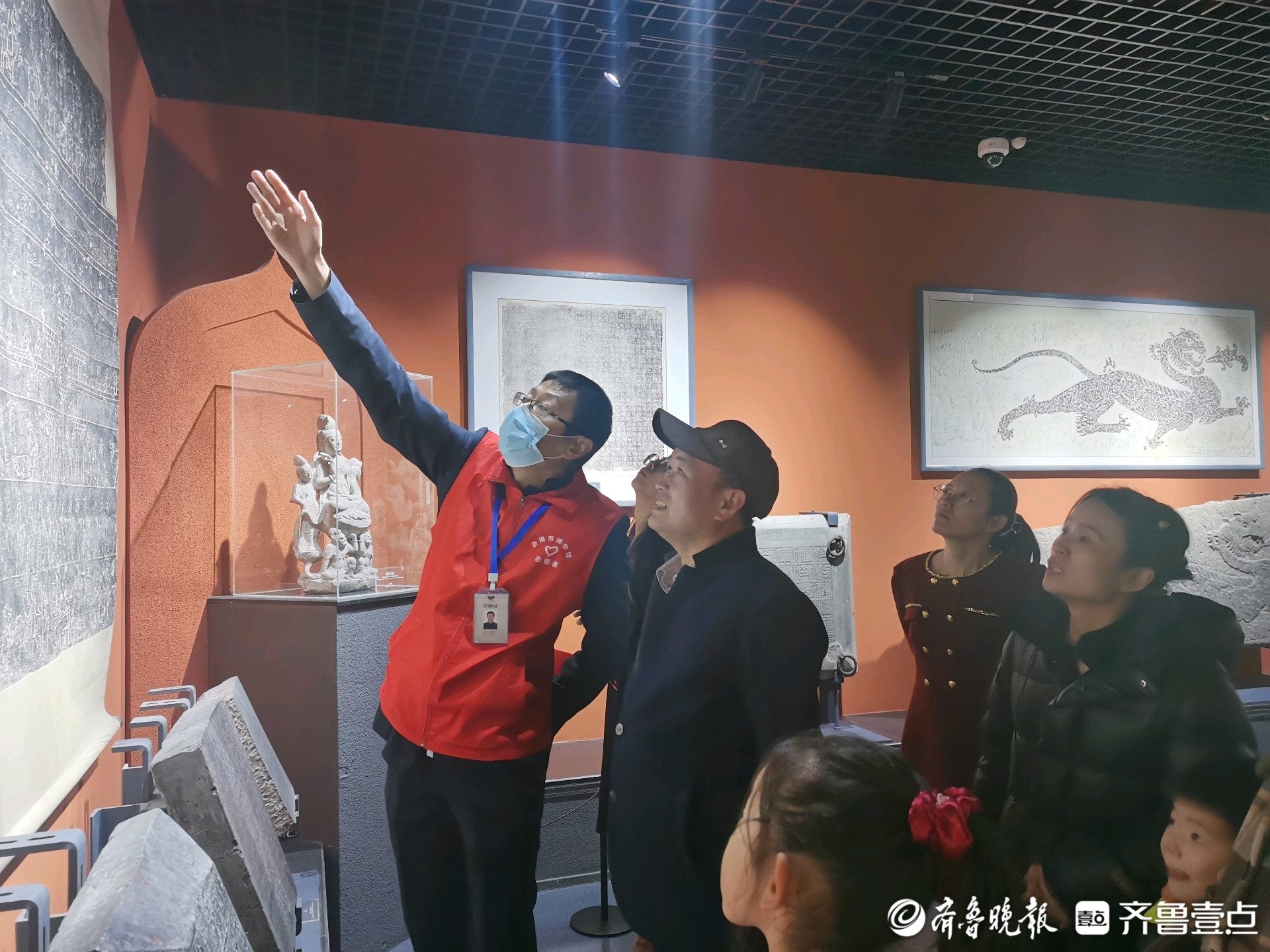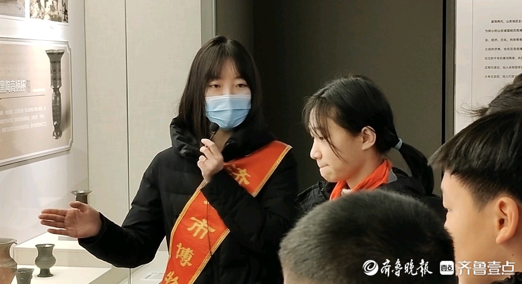 “现在我们看到的文物是……”戴好讲解器、接待游客,一场讲解开始了。针对不同的游客,成诚有着自己的一套讲解办法。孩子们喜欢听故事,她就侧重介绍文物背后的小故事,大人们想听更详细的知识,她介绍文物则更全面一些。并且,成诚在讲解时注重与观众们之间开展互动。“同学们,有谁知道古代济南的历山是哪里呀?”“泰山与黄河并称什么呢?”在讲解时,根据参观内容,她时不时地抛出这些问题,引领游客们进行思考。