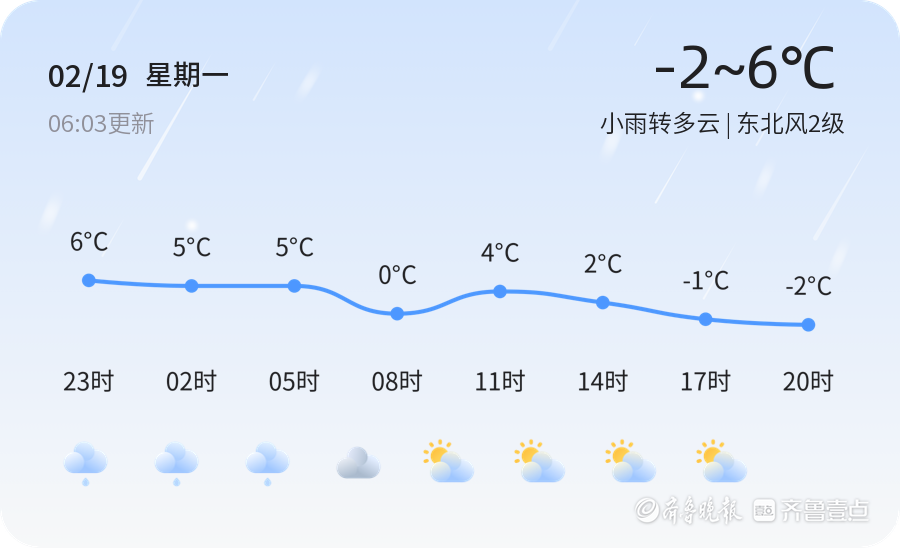 【滨州天气】2月19日,温度-2℃~6℃,小雨转多云