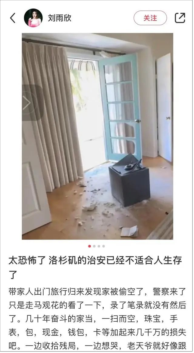 她在文中还称:“加州这次之后是真不想呆了,留下了强烈的心理阴影,不敢睡觉,这几天维修工人和保洁给我讲述了他们帮助其他家被抢的维修经历,简直太可怕了,有的家一个月被光顾五次 ,有的第一天没偷完第二天又来偷,还打伤了人,警察来了也没解决任何问题,全靠自己保护自己,这样的治安还让人怎么敢居住?所有安保系统有工具让它们屏蔽失灵。连银行也经常被盗,有人保险柜埋地板里都被勘测出来挖了扛走了。我住在最好的区,用了那么多安保系统,贼来的时候,adt、ring全都被屏蔽。现在觉得住这最好的方法就是多买保险,养个十几只烈犬,家里常年不离人,学枪自己保护自己,其他都没用!”