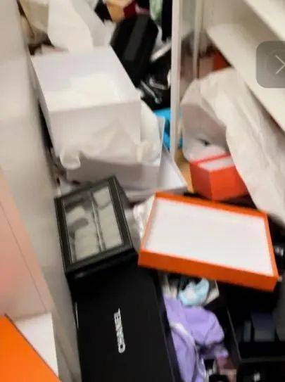 从她分享出来的照片中可以看到,家中的柜子被拆开,物品和名牌纸盒散落一地,陈列物品的柜台已经空无一物。