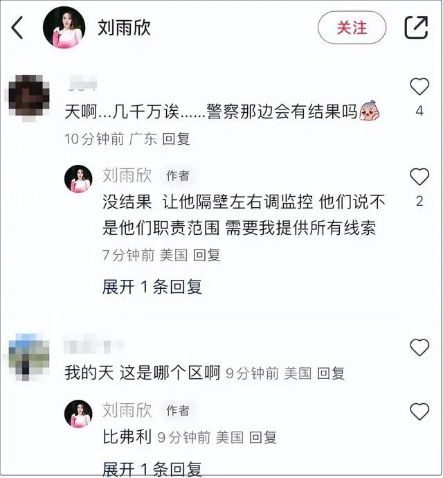 据刘雨欣在评论区透露,她住在比弗利,已报警但没结果。公开资料显示,比弗利山庄(Beverly Hills)位于美国洛杉矶,有“全世界最尊贵住宅区”称号,被人们称为财富名利的代表和象征。