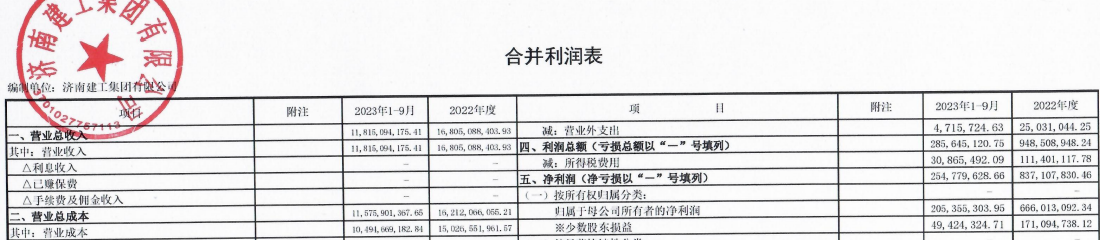 此外,今年二月济南建工集团2023年三季度合并及母公司财务报表的发布,系该公司组建以来首次披露详尽业绩情况。2022年以及2023年前三季度,济南建工集团营业总收入分别为168.81亿元、118.15亿元,净利润分别为8.37亿元、2.54亿元,经营活动净现金流分别为-8.43亿元、-8.39亿元。