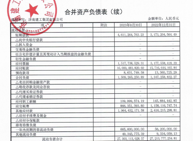 资产方面,截至2023年9月底,济南建工集团资产总额为365.43亿元,负债总额为296.94亿元,资产负债率约为81.25%。集团主要资产为流动资产,合计330.61亿元,其中合同资产为123.64亿元;主要负债为流动负债,合计273.03亿元,其中应付账款为160亿元。