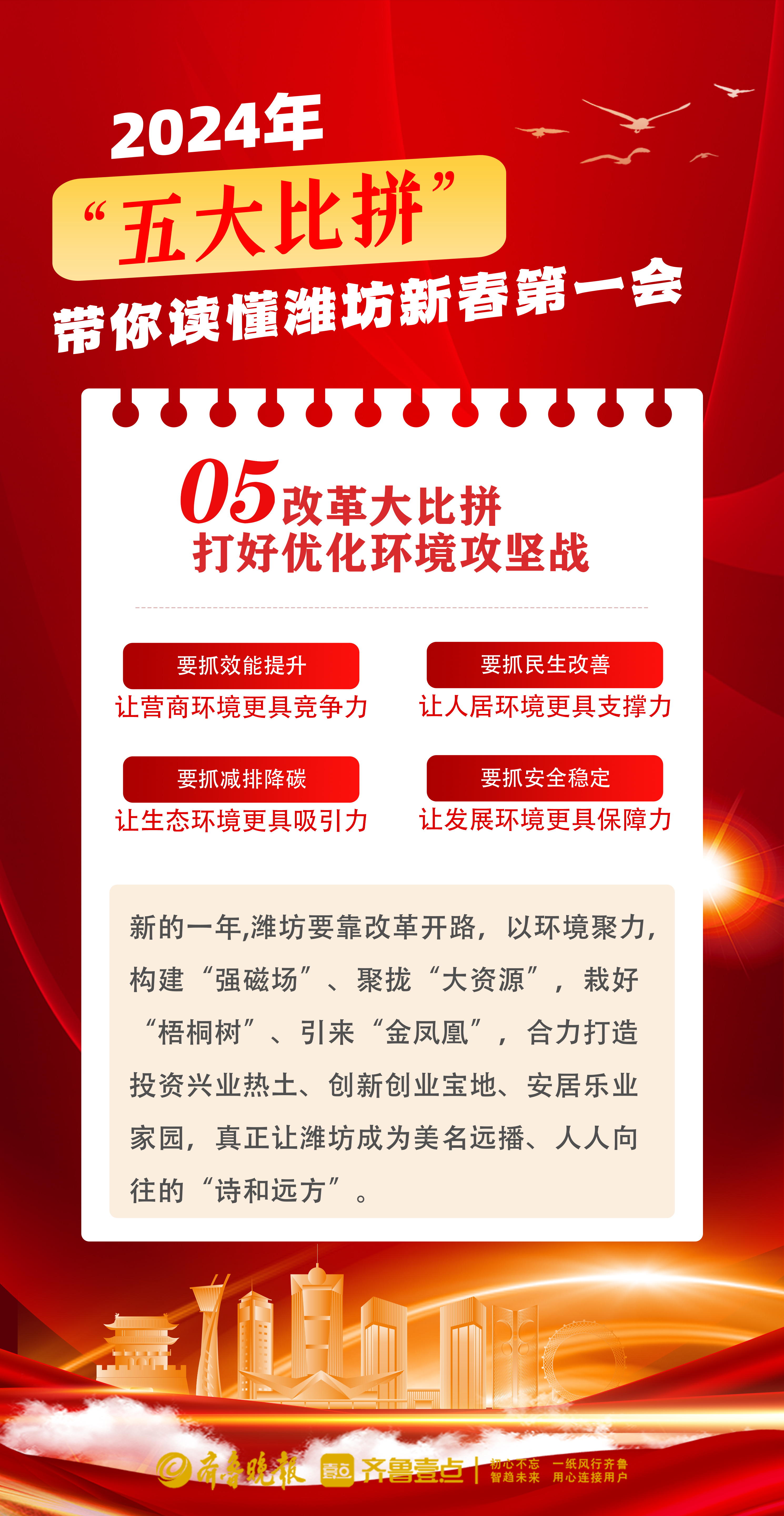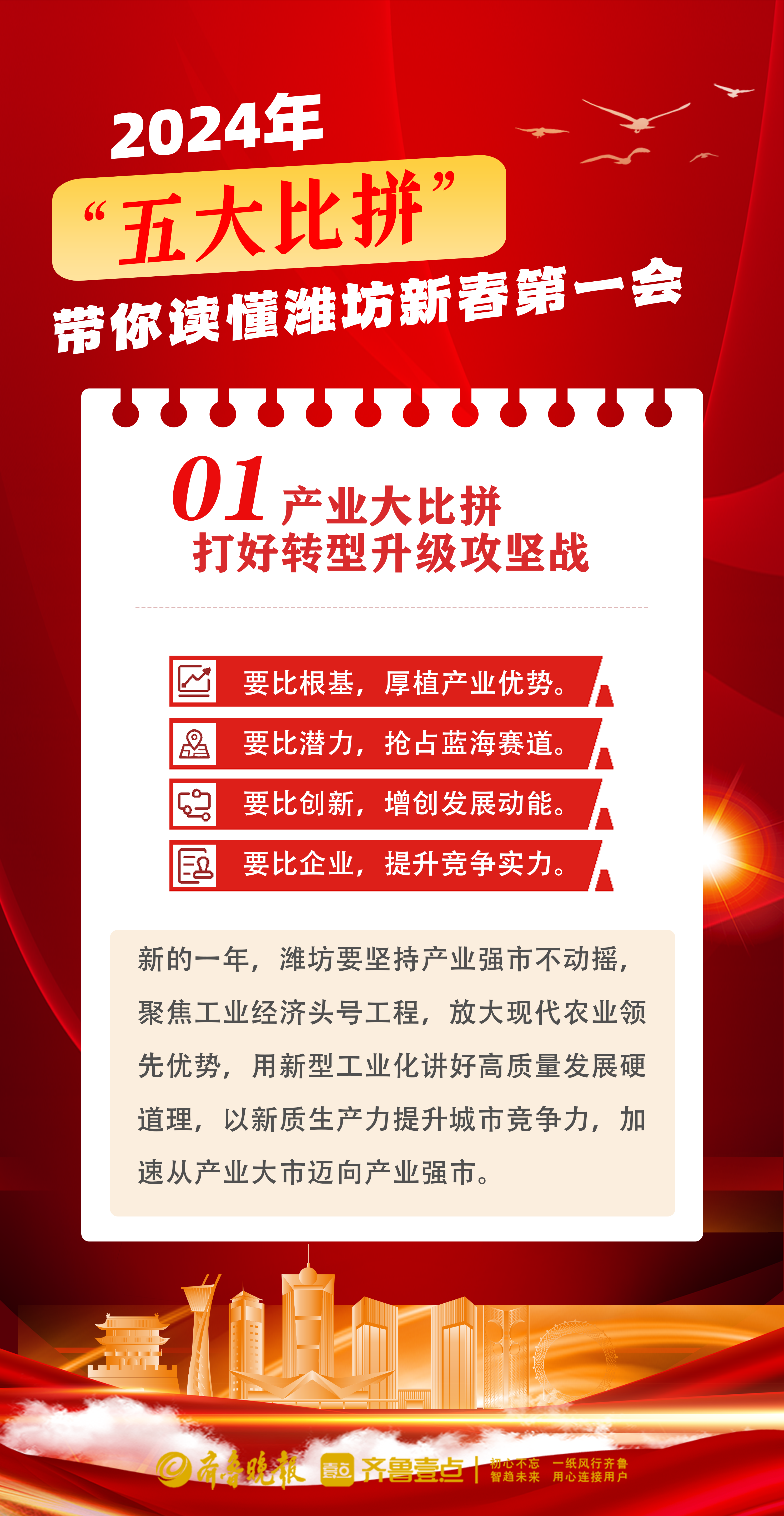 壹点海报|“五大比拼”带你读懂潍坊新春第一会 大众报业·齐鲁壹点 2024-02-20 3072 2月18日,潍坊召开“新春第一会”——全市工作动员大会,发布新春第一令。 2024年,潍坊怎么干?拼着干!“五大比拼”带你读懂潍坊新春第一会。 在“新春第一会”上,潍坊市委书记刘运明确了五大比拼——产业大比拼、开放大比拼、招引大比拼、项目大比拼、改革大比拼。 (设计 卞彦慧 文案 李旭旭) 责任编辑:李旭旭