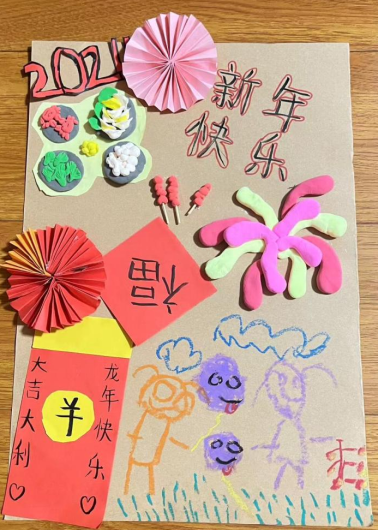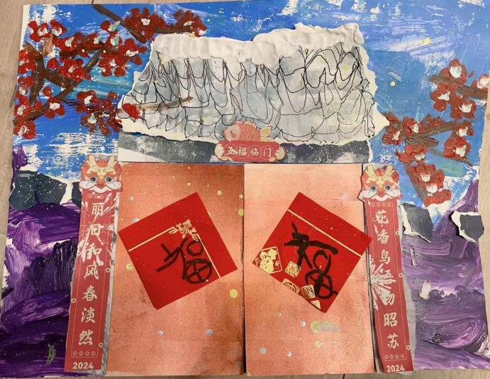 作品运用丰富多彩的颜料、黏土、贴纸等材料,描绘了过年时寒梅在雪中绽放、家家户户贴上新春联和福字的温馨场面。