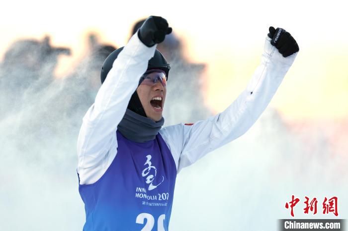 21日,河南队小将陈硕在第十四届全国冬季运动会自由式滑雪男子空中技巧公开组决赛中夺冠。