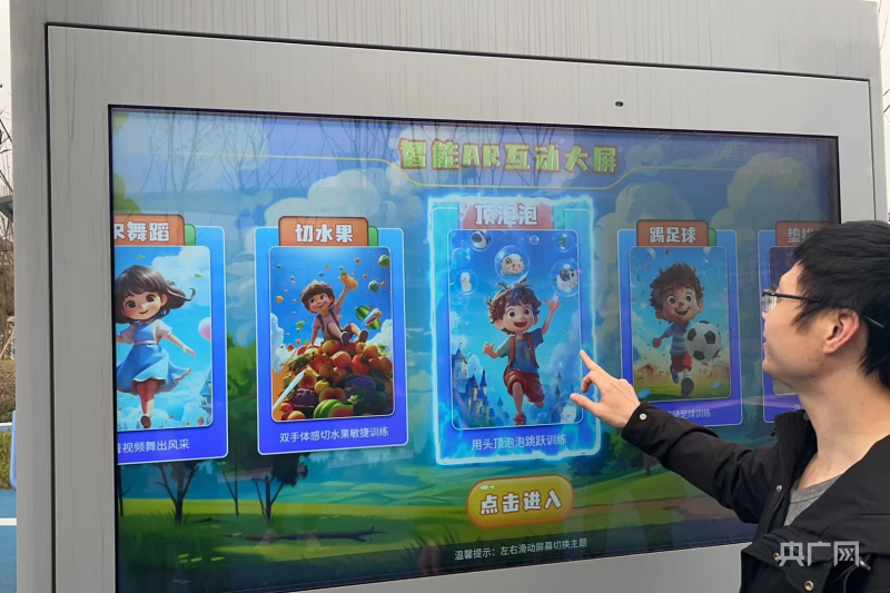 除此之外,该大屏还有丰富多彩的游戏,如切水果、顶泡泡、踢足球、AR舞蹈、记忆大师、垫排球等,能够让小朋友们共同玩耍。