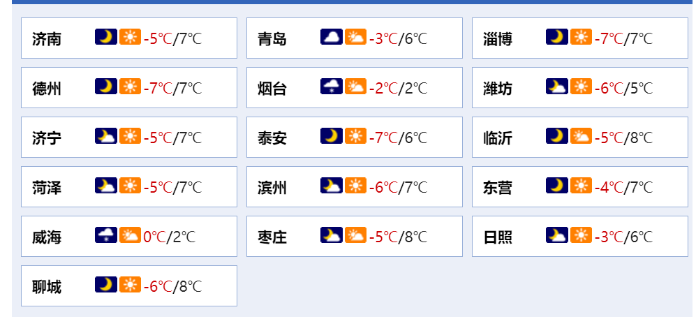 最低气温:鲁中山区-9℃左右,威海-1℃左右,其他地区-6℃左右。