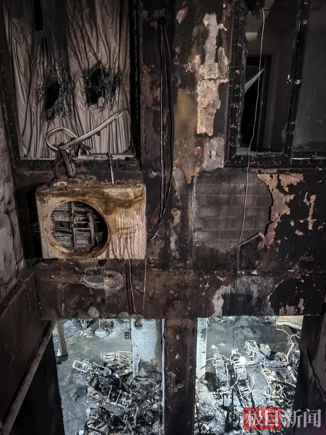 24日,记者在该失火单元楼核心区域看到,一楼架空层有大量被烧毁的电动自行车残骸,以及被烧毁的充电桩残骸,呈灰黑色,地面被灰黑色的水覆盖。沿着与架空层紧邻的天井向上看去,天井的墙体已被熏黑。记者在近处看到,架空层与二楼间一处空调外机熔化后已变形。天井周围,是楼道、居民家厨房及房间窗台,窗框被严重烧毁。