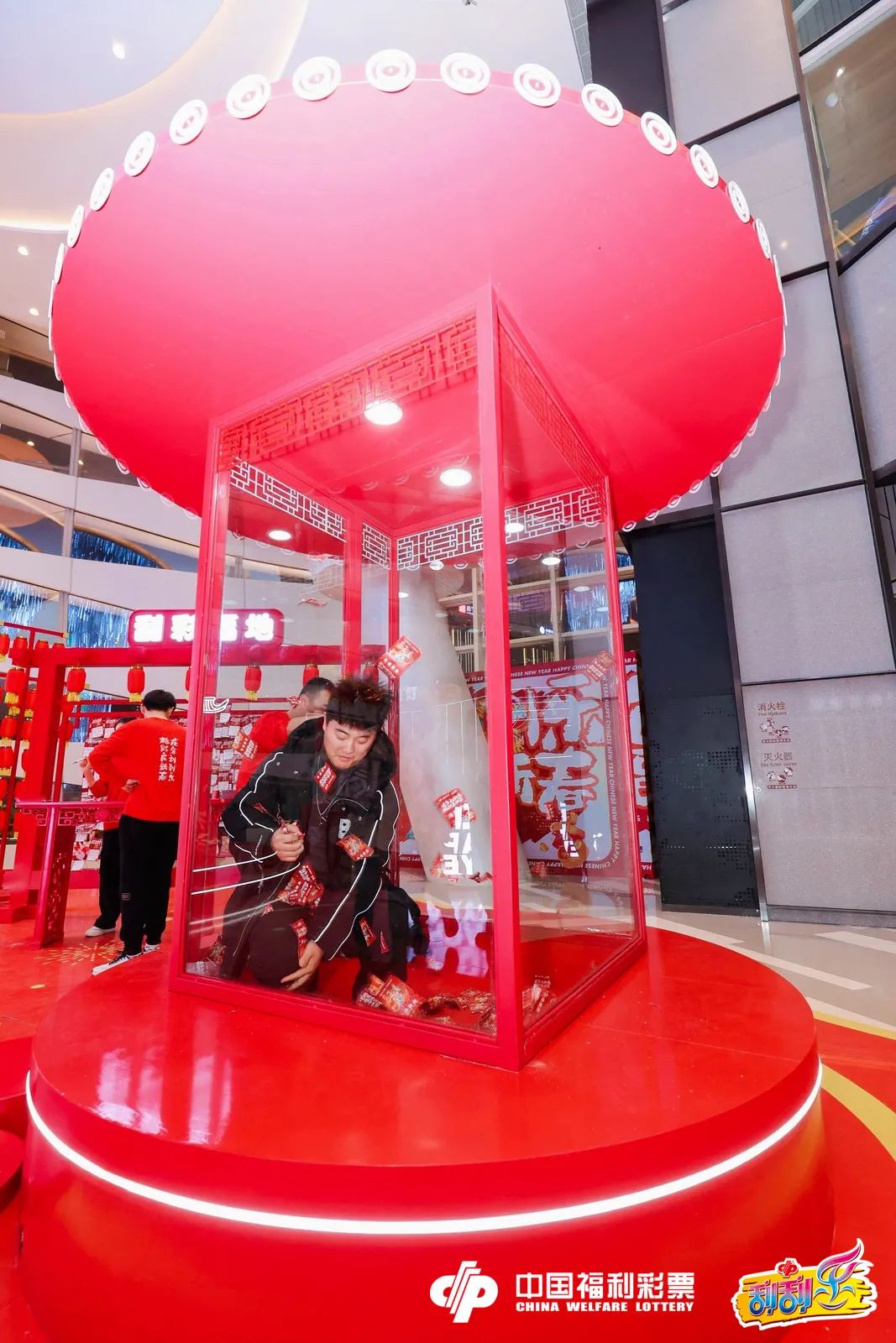 (大家进入“好运福彩屋”后,鼓风机吹动大奖标签,参与者抓取最终大奖)