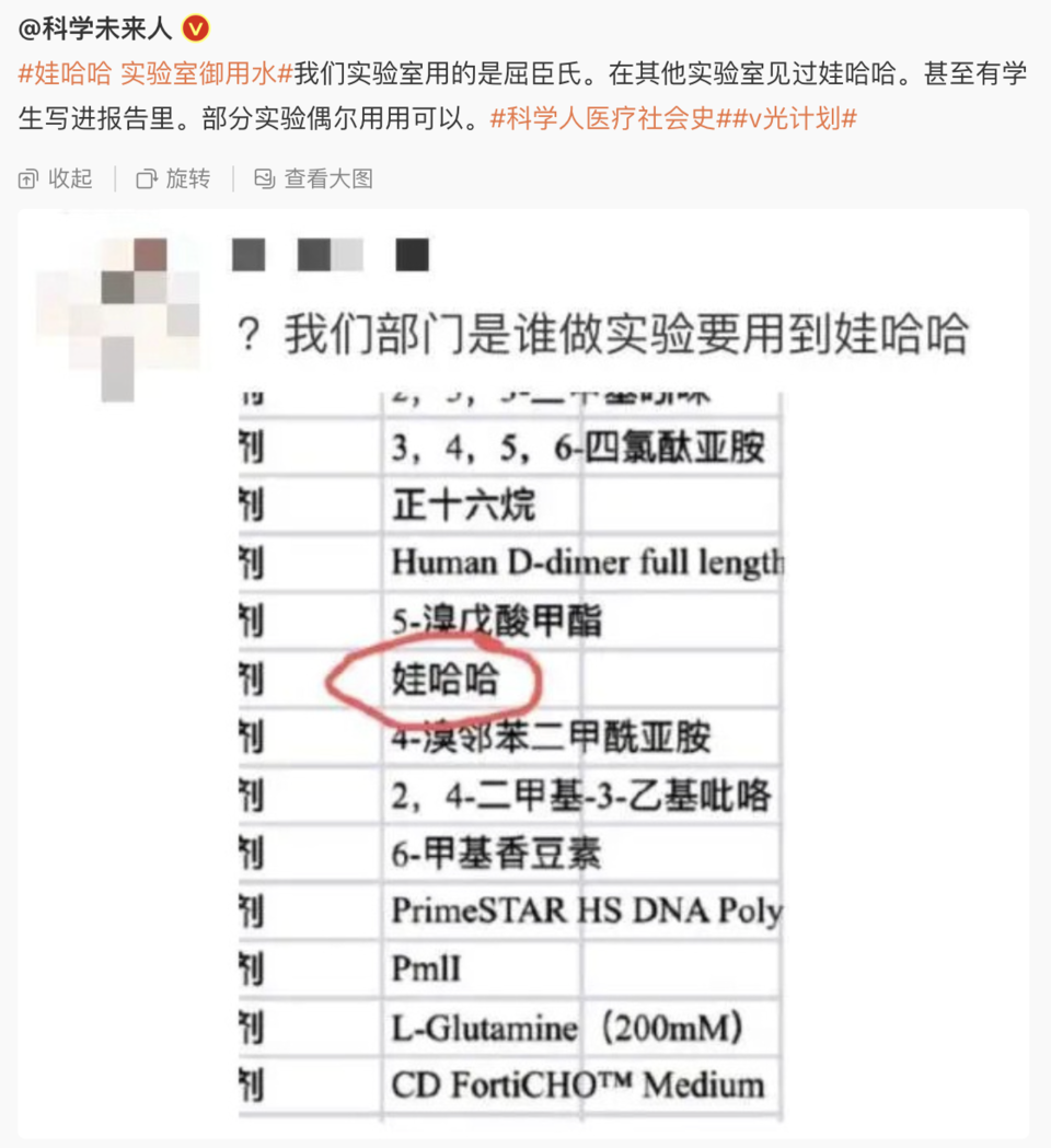 著名科技大V @科技未来人 就表示,自己实验室用的是屈臣氏,在其他实验室见过娃哈哈,甚至有学生写进报告里,部分实验偶尔用用可以。