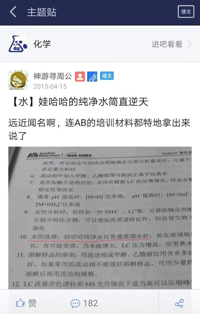 连ABI(美国应用生物系统公司)的培训材料,都特地cue到娃哈哈纯净水: