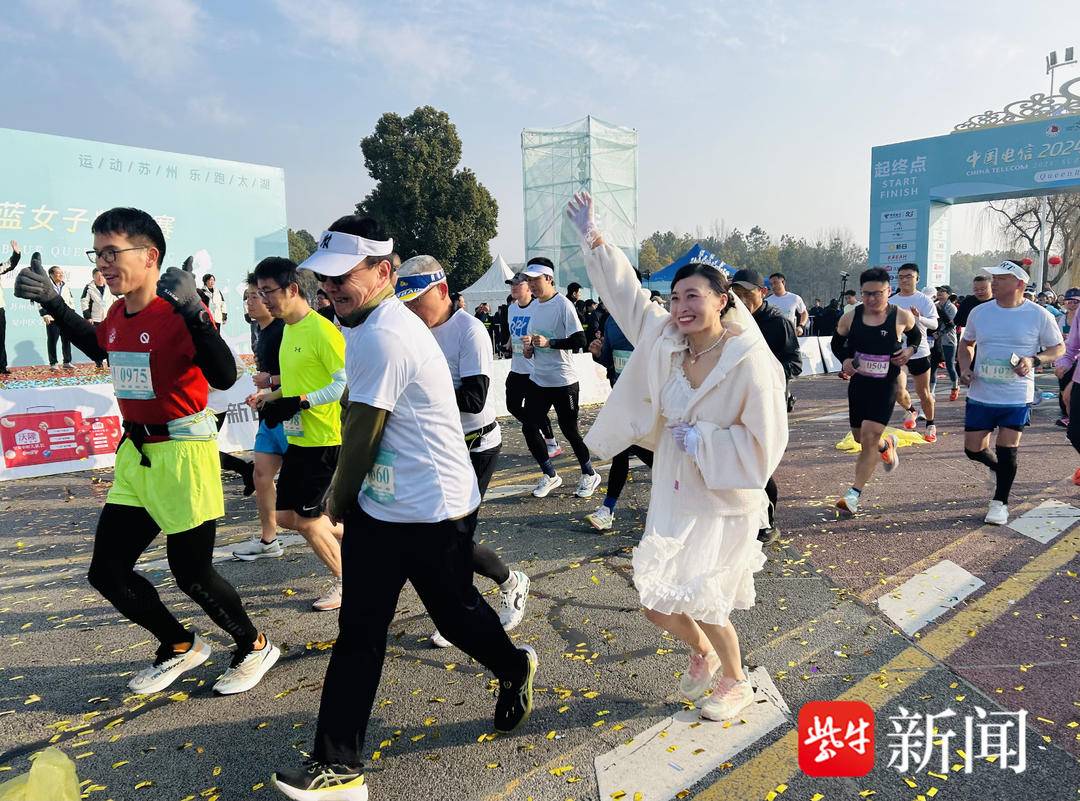 比赛队伍中,不少女性跑友们结伴而行,在奔跑中尽情绽放自己。“第一次参加女子精英赛,感觉很特别,不仅是体育赛事,还可以沿途欣赏太湖风景、感受太湖文化。”一位穿着洁白婚纱的女跑友笑着说道,她还品尝了糖粥、豆花等苏州特色美食,补充能量还满足了味蕾。“完赛后还收到了玫瑰花,这份节日的祝福很贴心。”另一位女跑友开心说道。